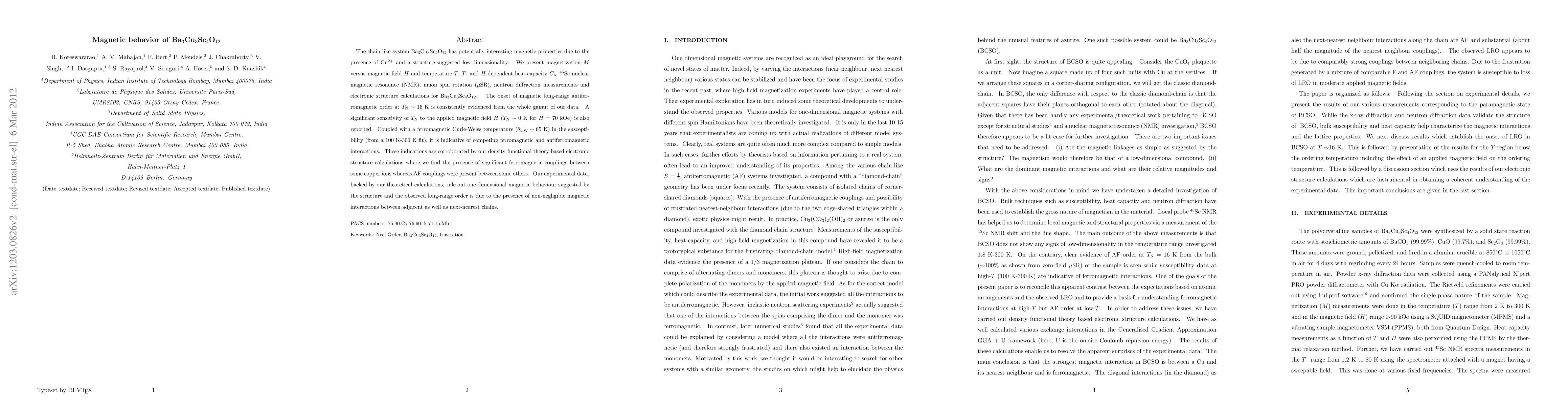 The chain-like system Ba_{3}Cu_{3}Sc_4O_{12} has potentially interesting magnetic properties due to the presence of Cu^{2+} and a structure-suggested low-dimensionality. We present magnetization M versus magnetic field H and temperature T, T- and H-dependent heat-capacity C_{p}, ^{45}Sc nuclear magnetic resonance (NMR), muon spin rotation ({\mu}SR), neutron diffraction measurements and electronic structure calculations for Ba_{3}Cu_{3}Sc_{4}O_{12}. The onset of magnetic long-range antiferromagnetic order at T_{N} ~16 K is consistently evidenced from the whole gamut of our data. A significant sensitivity of T_{N} to the applied magnetic field H (T_{N}~0 K for H=70 kOe) is also reported. Coupled with a ferromagnetic Curie-Weiss temperature ({\theta}_{CW}~65 K) in the susceptibility (from a 100 K-300 K fit), it is indicative of competing ferromagnetic and antiferromagnetic interactions. These indications are corroborated by our density functional theory based electronic structure calculations where we find the presence of significant ferromagnetic couplings between some copper ions whereas AF couplings were present between some others. Our experimental data, backed by our theoretical calculations, rule out one-dimensional magnetic behaviour suggested by the structure and the observed long-range order is due to the presence of non-negligible magnetic interactions between adjacent as well as next-nearest chains.