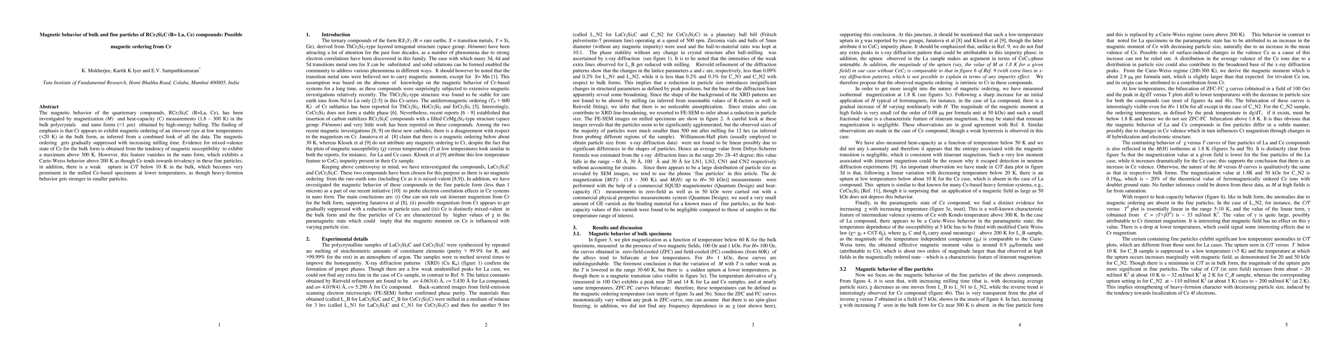 The magnetic behavior of RCr2Si2C (R = La, Ce) compounds shows itinerant magnetic ordering in bulk forms, particularly for Cr, while nano forms exhibit suppressed magnetic ordering and a tendency towards triviality in Ce valence. The bulk exhibits heavy-fermion behavior, which intensifies in nano forms.