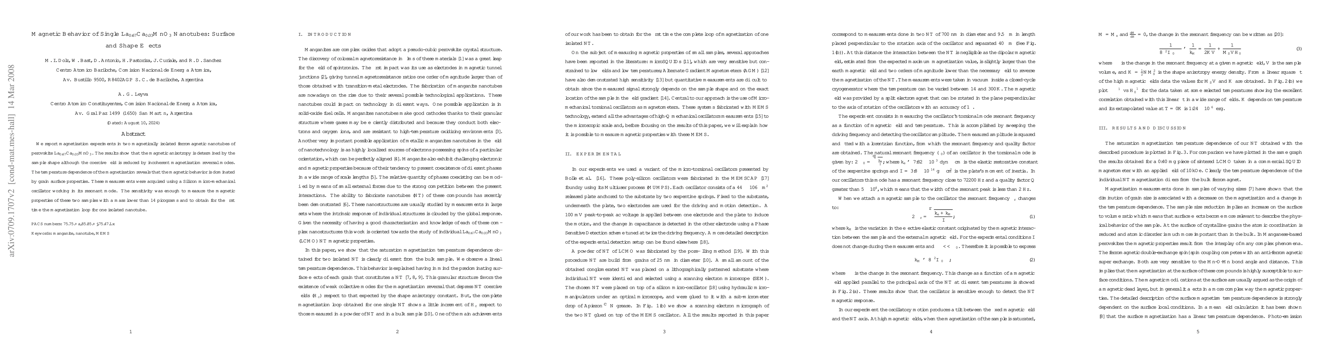 This study used a sensitive micro-mechanical oscillator to measure the magnetic properties of individual La₀.₆₇Ca₀.₃₃MnO₃ nanotubes, revealing that their magnetic behavior is mainly influenced by shape and surface properties. The findings provide new insights into how nanoscale shape and surface effects impact magnetism in ferromagnetic nanotubes.