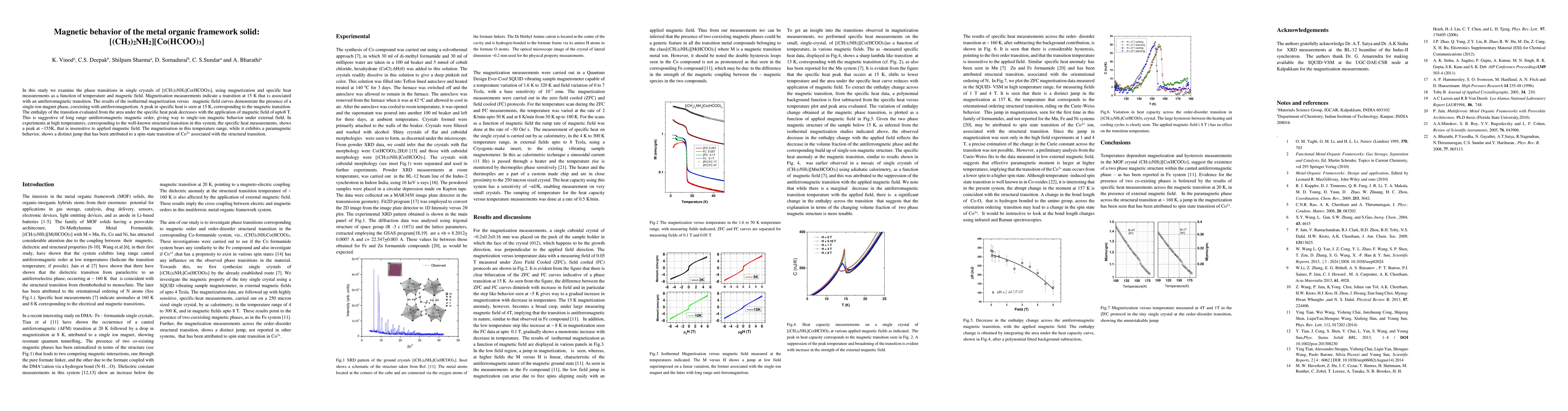 Researchers studied the magnetic behavior of a metal organic framework solid and found an antiferromagnetic transition at 15 K, which shifts to single-ion magnet phase under external magnetic fields.