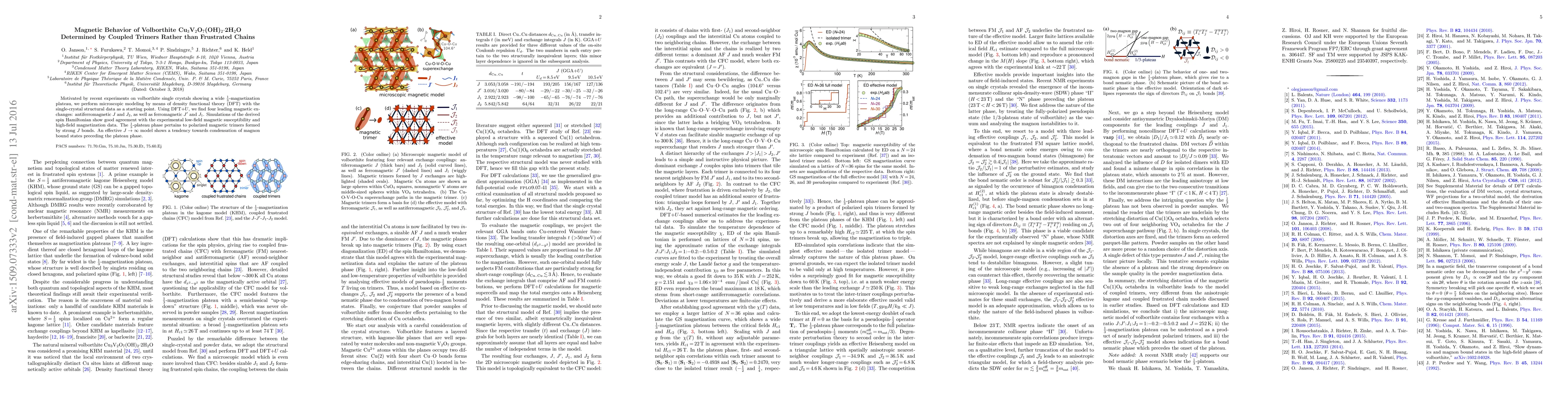 Researchers used density functional theory to model volborthite's magnetic behavior, finding four key exchanges that match experimental data, suggesting a 1/3-magnetization plateau is caused by polarized magnetic trimers.