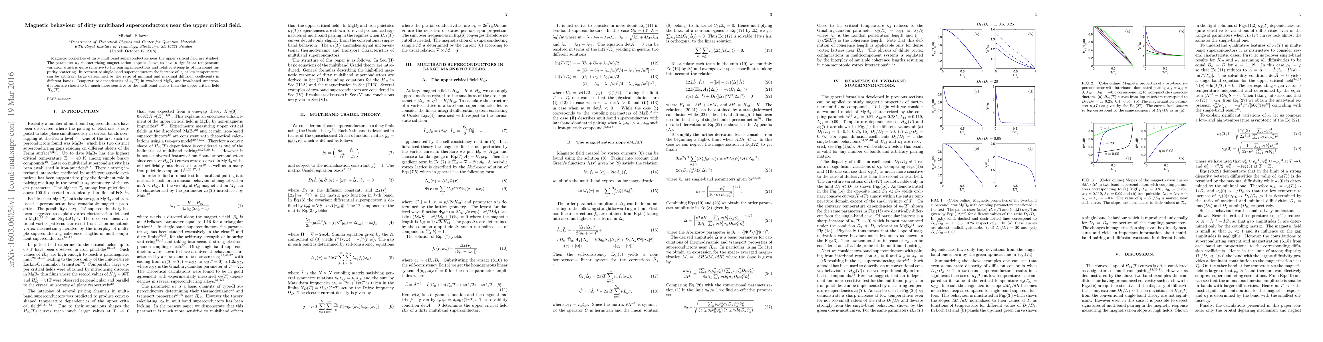 This paper investigates the magnetic behavior of dirty multiband superconductors near the upper critical field, revealing significant temperature variations in the magnetization slope parameter $\kappa_2$ influenced by pairing interactions and impurity scattering strengths. Unlike single-band superconductors, $\kappa_2$ can grow substantially at low temperatures, determined by the ratio of diffusion coefficients across different bands, with $\kappa_2(T)$ showing greater sensitivity to multiband effects than $H_{c2}(T)$ in materials like MgB$_2$ and iron-based superconductors.