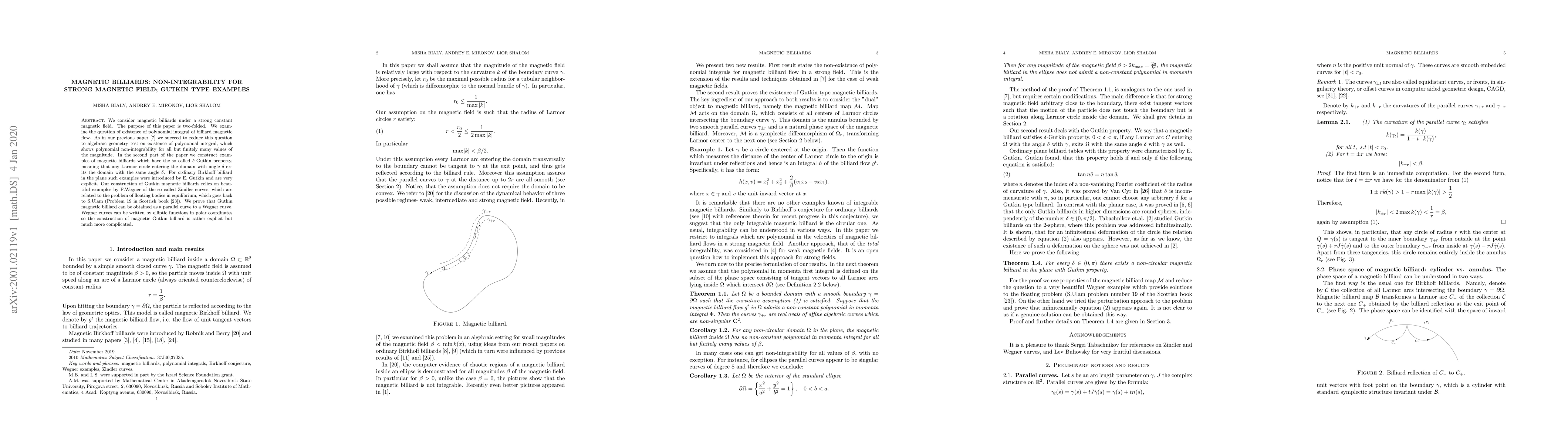 We consider magnetic billiards under a strong constant magnetic field. The purpose of this paper is two-folded. We examine the question of existence of polynomial integral of billiard magnetic flow. We succeed to reduce this question to algebraic geometry test on existence of polynomial integral, which shows polynomial non-integrability for all but finitely many values of the magnitude. In the second part of the paper we construct examples of magnetic billiards which have the so called $\delta$-Gutkin property, meaning that any Larmor circle entering the domain with angle $\delta$ exits the domain with the same angle $\delta$. For ordinary Birkhoff billiard in the plane such examples were introduced by E. Gutkin and are very explicit. Our construction of Gutkin magnetic billiards relies on beautiful examples by F.Wegner of the so called Zindler curves, which are related to the problem of floating bodies in equilibrium, which goes back to S.Ulam. We prove that Gutkin magnetic billiard can be obtained as a parallel curve to a Wegner curve. Wegner curves can be written by elliptic functions in polar coordinates so the construction of magnetic Gutkin billiard is rather explicit but much more complicated.