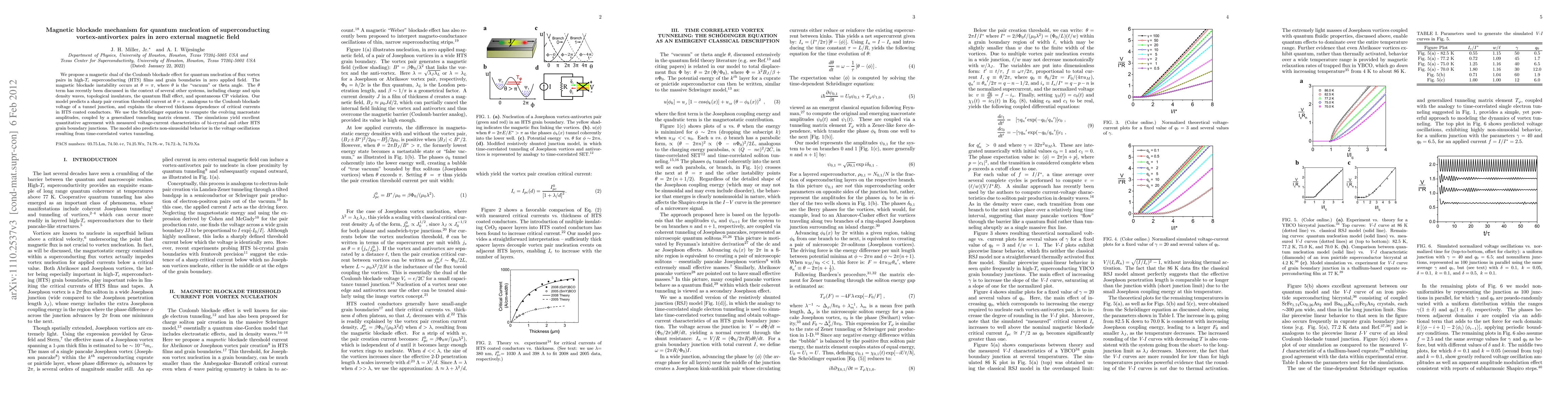 We propose a magnetic dual of the Coulomb blockade effect for quantum nucleation of flux vortex pairs in high-Tc superconducting (HTS) films and grain boundaries in zero applied field. The magnetic blockade instability occurs at {\theta} = {\pi}, where {\theta} is the "vacuum" or theta angle. The {\theta} term has recently been discussed in the context of several other systems, including charge and spin density waves, topological insulators, the quantum Hall effect, and spontaneous CP violation. Our model predicts a sharp pair creation threshold current at {\theta} = {\pi}, analogous to the Coulomb blockade voltage of a tunnel junction, and explains the observed thickness dependence of critical currents in HTS coated conductors. We use the Schr\"odinger equation to compute the evolving macrostate amplitudes, coupled by a generalized tunneling matrix element. The simulations yield excellent quantitative agreement with measured voltage-current characteristics of bi-crystal and other HTS grain boundary junctions. The model also predicts non-sinusoidal behavior in the voltage oscillations resulting from time-correlated vortex tunneling.