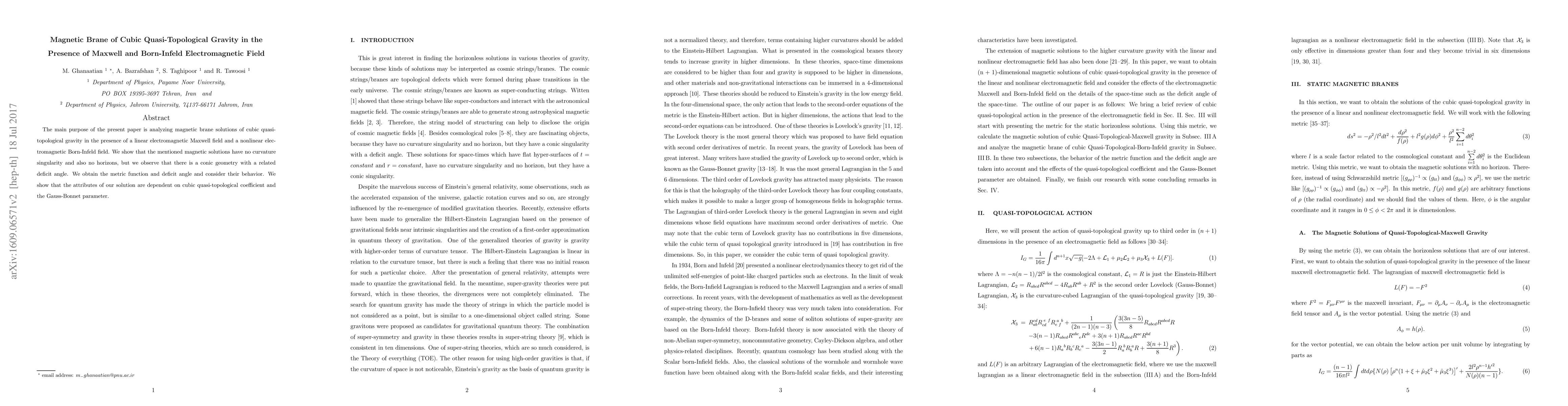 This paper analyzes magnetic brane solutions in cubic quasi-topological gravity with Maxwell and Born-Infeld electromagnetic fields, revealing no curvature singularity or horizons, but a conic geometry with a deficit angle. The solution's attributes depend on the cubic quasi-topological coefficient and the Gauss-Bonnet parameter.