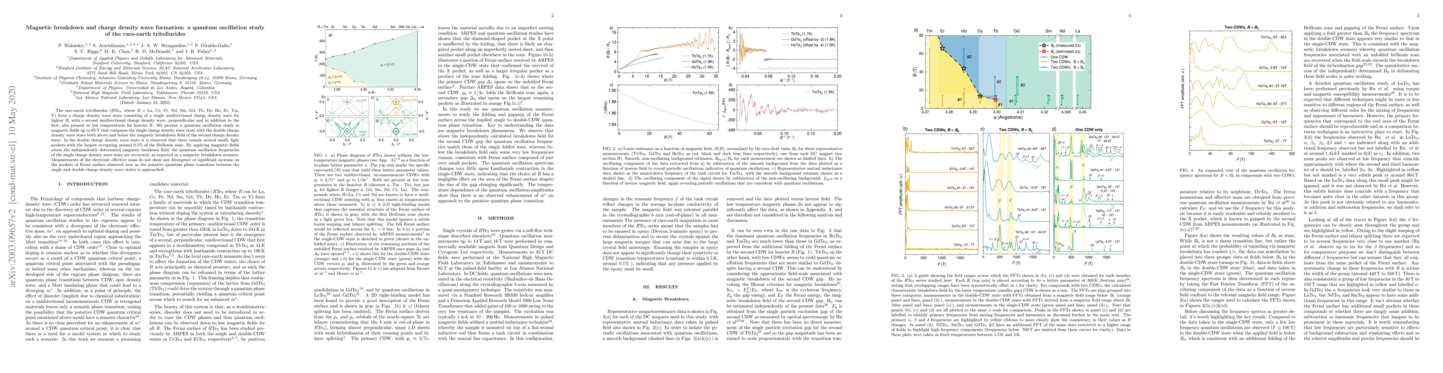 The rare-earth tritellurides ($R$Te$_3$, where $R$ = La, Ce, Pr, Nd, Sm, Gd, Tb, Dy, Ho, Er, Tm, Y) form a charge density wave state consisting of a single unidirectional charge density wave for lighter $R$, with a second unidirectional charge density wave, perpendicular and in addition to the first, also present at low temperatures for heavier $R$. We present a quantum oscillation study in magnetic fields up to 65T that compares the single charge density wave state with the double charge density wave state both above and below the magnetic breakdown field of the second charge density wave. In the double charge density wave state it is observed that there remain several small, light pockets with the largest occupying around 0.5% of the Brillouin zone. By applying magnetic fields above the independently determined magnetic breakown field, the quantum oscillation frequencies of the single charge density wave state are recovered, as expected in a magnetic breakdown scenario. Measurements of the electronic effective mass do not show any divergence or significant increase on the pockets of Fermi surface observed here as the putative quantum phase transition between the single and double charge density wave states is approached.