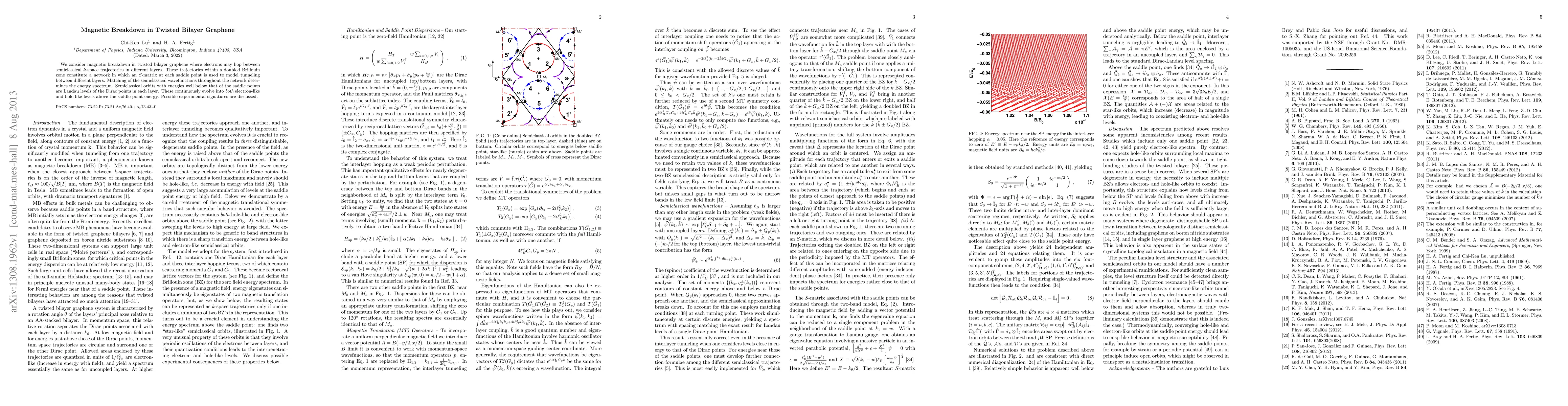 We consider magnetic breakdown in twisted bilayer graphene where electrons may hop between semiclassical $k$-space trajectories in different layers. These trajectories within a doubled Brillouin zone constitute a network in which an $S$-matrix at each saddle point is used to model tunneling between different layers. Matching of the semiclassical wavefunctions throughout the network determines the energy spectrum. Semiclassical orbits with energies well below that of the saddle points are Landau levels of the Dirac points in each layer. These continuously evolve into {\it both} electron-like and hole-like levels above the saddle point energy. Possible experimental signatures are discussed.