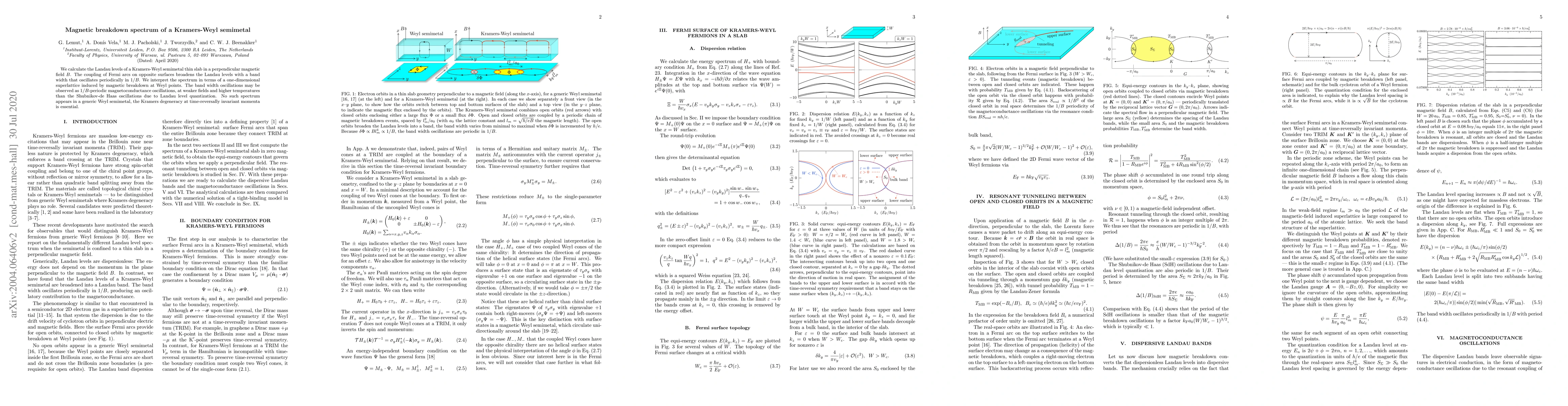 We calculate the Landau levels of a Kramers-Weyl semimetal thin slab in a perpendicular magnetic field $B$. The coupling of Fermi arcs on opposite surfaces broadens the Landau levels with a band width that oscillates periodically in $1/B$. We interpret the spectrum in terms of a one-dimensional superlattice induced by magnetic breakdown at Weyl points. The band width oscillations may be observed as $1/B$-periodic magnetoconductance oscillations, at weaker fields and higher temperatures than the Shubnikov-de Haas oscillations due to Landau level quantization. No such spectrum appears in a generic Weyl semimetal, the Kramers degeneracy at time-reversally invariant momenta is essential.