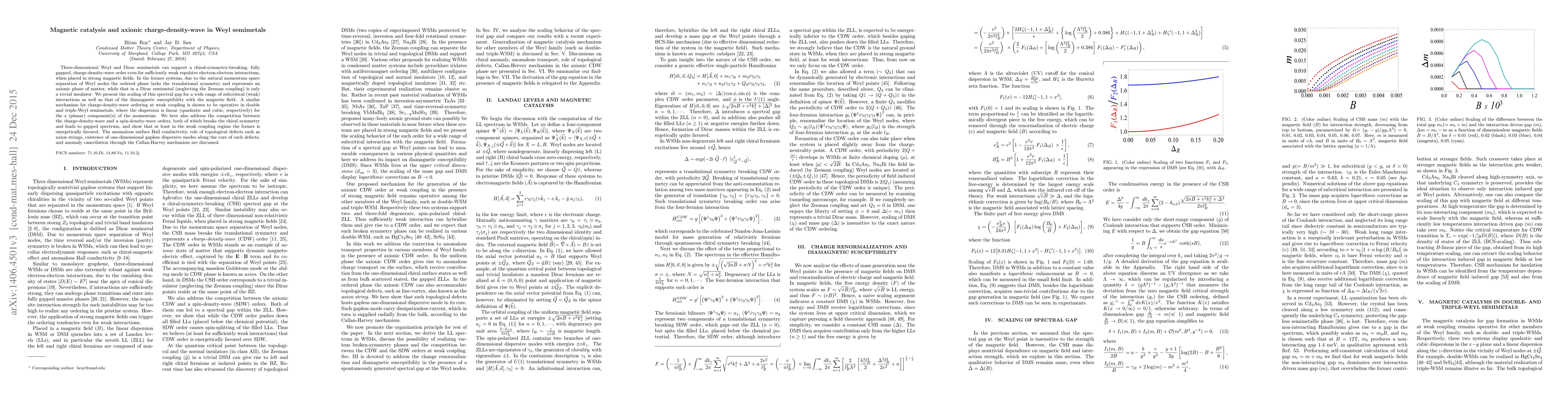 Research explores the emergence of a charge-density-wave (CDW) phase in 3D Weyl semimetals under strong magnetic fields, characterized by axionic order due to chiral symmetry breaking. The study also examines the competition between CDW and spin-density-wave orders, favoring CDW in weak coupling, and discusses related topological phenomena.