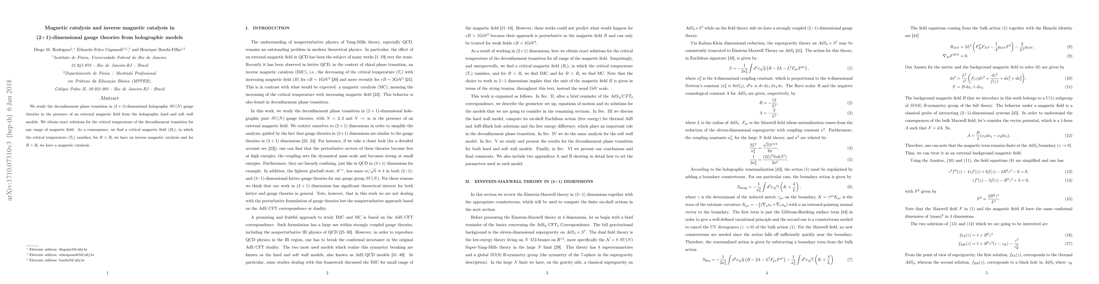 This paper investigates the deconfinement phase transition in (2+1)-dimensional holographic SU(N) gauge theories under an external magnetic field, finding exact solutions for the critical temperature. It identifies a critical magnetic field where the critical temperature vanishes, leading to inverse magnetic catalysis for weaker fields and magnetic catalysis for stronger fields.