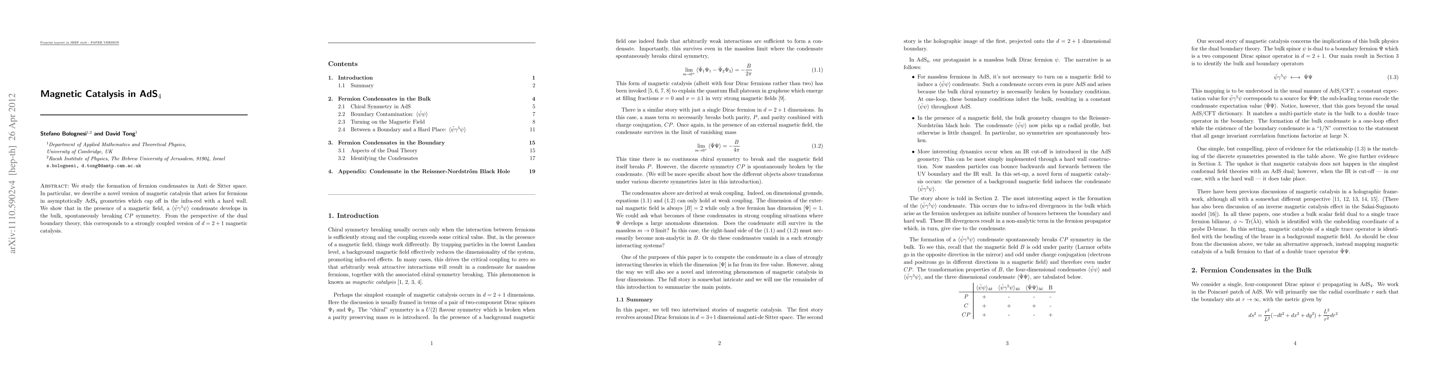 We study the formation of fermion condensates in Anti de Sitter space. In particular, we describe a novel version of magnetic catalysis that arises for fermions in asymptotically AdS4 geometries which cap off in the infra-red with a hard wall. We show that the presence of a magnetic field induces a fermion condensate in the bulk that spontaneously breaks CP symmetry. From the perspective of the dual boundary theory, this corresponds to a strongly coupled version of magnetic catalysis in d=2+1.