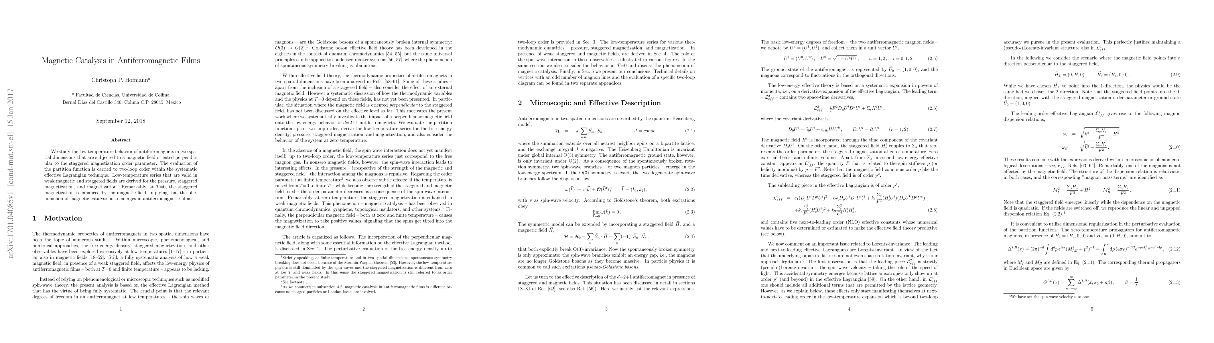 We study the low-temperature behavior of antiferromagnets in two spatial dimensions that are subjected to a magnetic field oriented perpendicular to the staggered magnetization order parameter. The evaluation of the partition function is carried to two-loop order within the systematic effective Lagrangian technique. Low-temperature series that are valid in weak magnetic and staggered fields are derived for the pressure, staggered magnetization, and magnetization. Remarkably, at $T$=0, the staggered magnetization is enhanced by the magnetic field, implying that the phenomenon of magnetic catalysis also emerges in antiferromagnetic films.