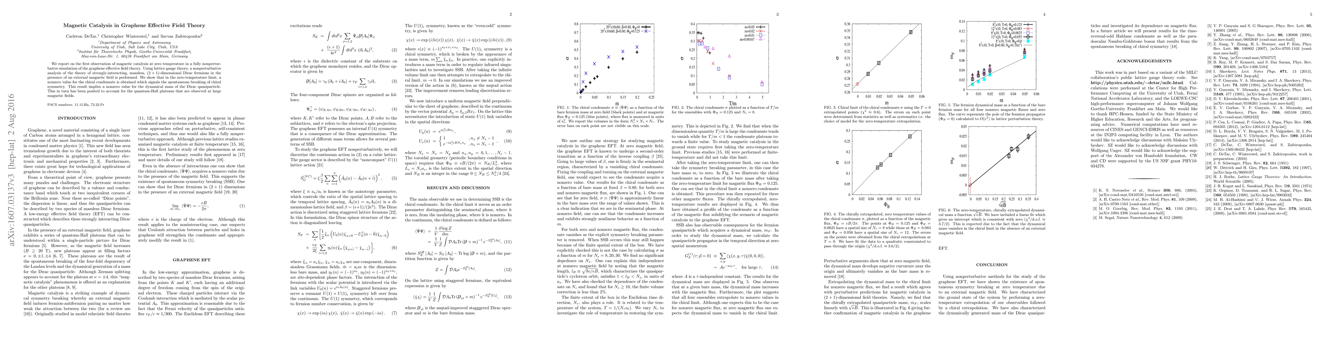 This paper reports the first observation of magnetic catalysis at zero temperature in graphene's effective field theory using lattice gauge theory. The study reveals a nonzero chiral condensate and dynamical mass of Dirac quasiparticles, indicating spontaneous chiral symmetry breaking and potentially explaining quantum-Hall plateaus under strong magnetic fields.