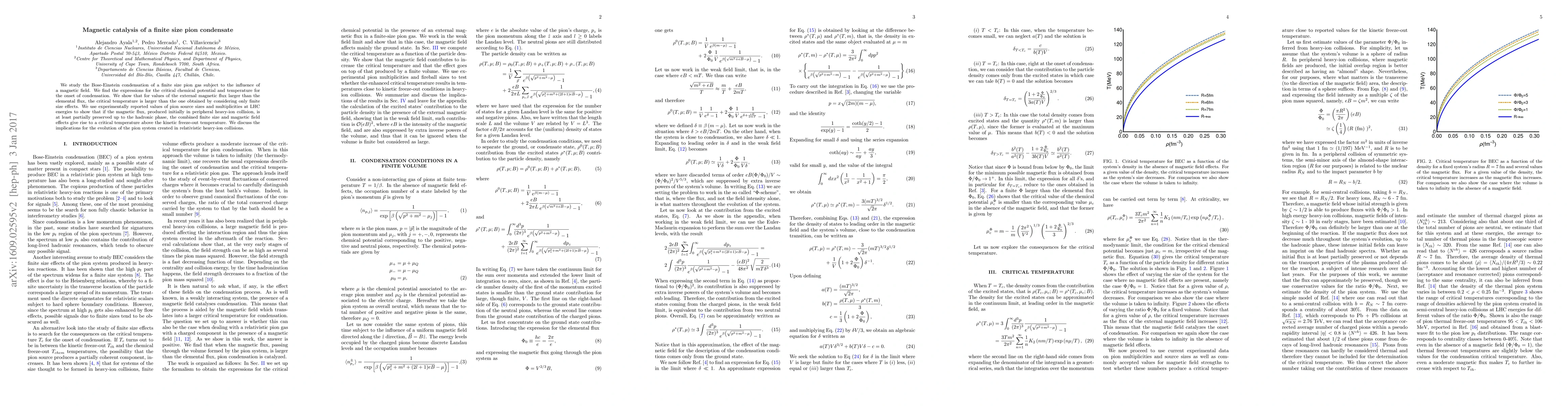 The study investigates how a magnetic field affects pion condensation in finite size gas, revealing that high magnetic flux can raise the critical temperature above kinetic freeze-out.