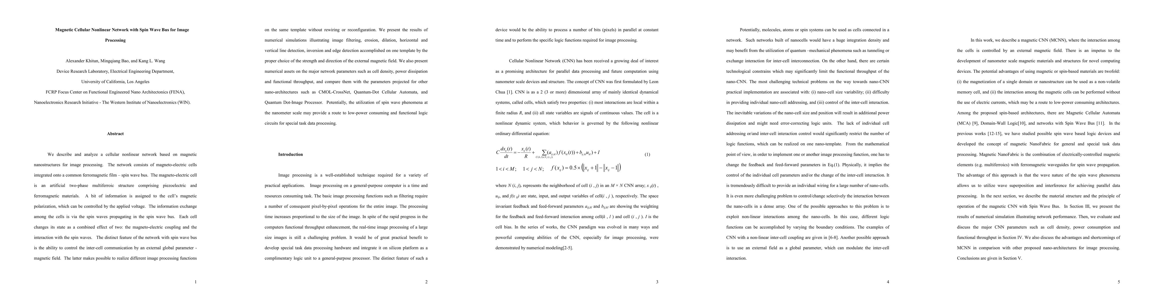 This paper presents a magnetic cellular nonlinear network utilizing spin wave buses for image processing, where magneto-electric cells on a ferromagnetic film communicate via spin waves. The network's inter-cell communication is controlled by an external magnetic field, enabling diverse image processing functions without rewiring, and demonstrates potential for low-power, efficient data processing.