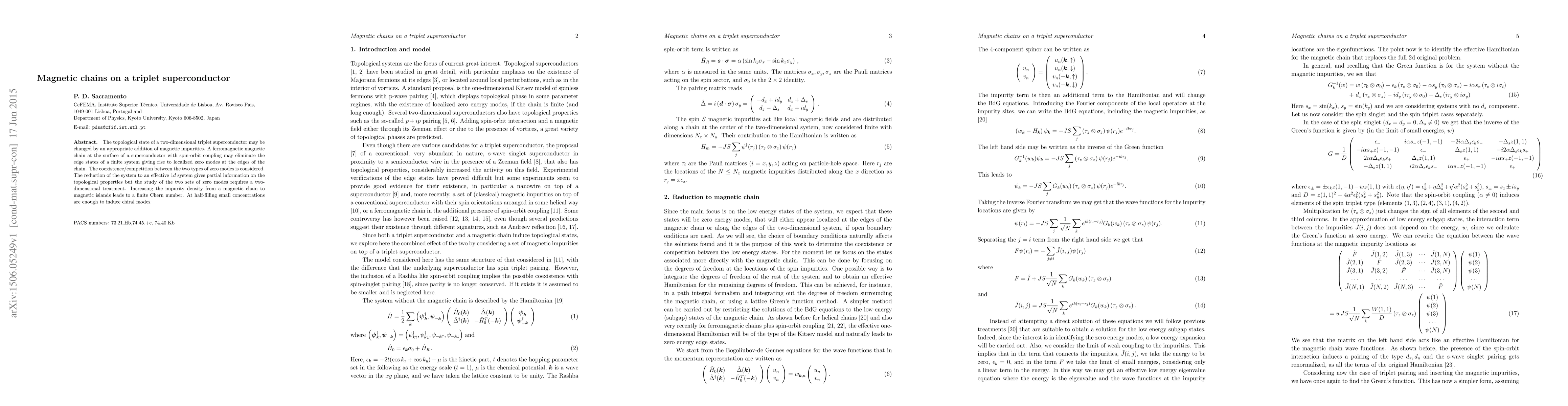 The topological state of a two-dimensional triplet superconductor may be changed by an appropriate addition of magnetic impurities. A ferromagnetic magnetic chain at the surface of a superconductor with spin-orbit coupling may eliminate the edge states of a finite system giving rise to localized zero modes at the edges of the chain. The coexistence/competition between the two types of zero modes is considered. The reduction of the system to an effective $1d$ system gives partial information on the topological properties but the study of the two sets of zero modes requires a two-dimensional treatment. Increasing the impurity density from a magnetic chain to magnetic islands leads to a finite Chern number. At half-filling small concentrations are enough to induce chiral modes.