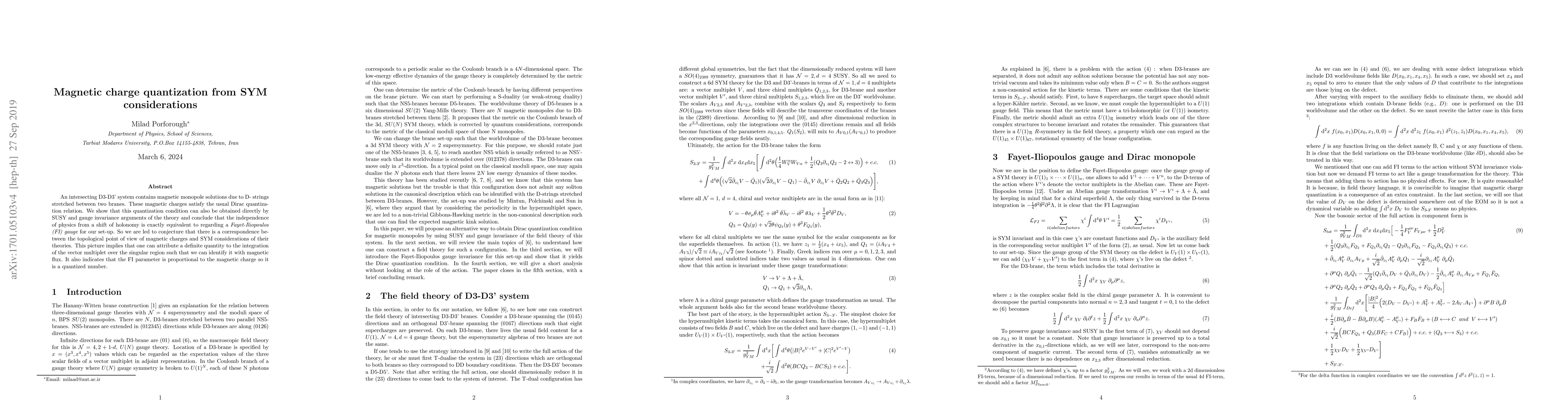 An intersecting D3-D3' system contains magnetic monopole solutions due to D- strings stretched between two branes. These magnetic charges satisfy the usual Dirac quantization relation. We show that this quantization condition can also be obtained directly by SUSY and gauge invariance arguments of the theory and conclude that the independence of physics from a shift of holonomy is exactly equivalent to regarding a {\it Fayet-Iliopoulos (FI) gauge} for our set-up. So we are led to conjecture that there is a correspondence between the topological point of view of magnetic charges and SYM considerations of their theories. This picture implies that one can attribute a definite quantity to the integration of the vector multiplet over the singular region such that we can identify it with magnetic flux. It also indicates that the FI parameter is proportional to the magnetic charge so it is a quantized number.