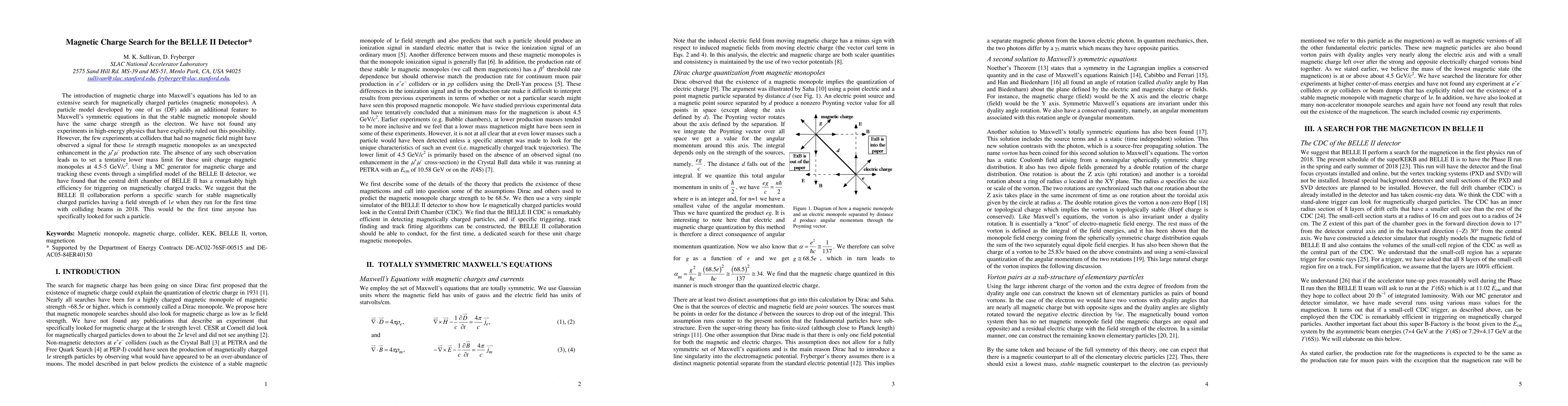 The introduction of magnetic charge into Maxwell's equations has led to an extensive search for magnetically charged particles (magnetic monopoles). A particle model developed by one of us (DF) adds an additional feature to Maxwell's symmetric equations in that the stable magnetic monopole should have the same charge strength as the electron. We have not found any experiments in high-energy physics that have explicitly ruled out this possibility. However, the few experiments at colliders that had no magnetic field might have observed a signal for these 1e strength magnetic monopoles as an unexpected enhancement in the mu+mu- production rate. The absence of any such observation leads us to set a tentative lower mass limit for these unit charge magnetic monopoles at 4.5-5 GeV/c2. Using a MC generator for magnetic charge and tracking these events through a simplified model of the BELLE II detector, we have found that the central drift chamber of BELLE II has a remarkably high efficiency for triggering on magnetically charged tracks. We suggest that the BELLE II collaboration perform a specific search for stable magnetically charged particles having a field strength of 1e when they run for the first time with colliding beams in 2018. This would be the first time anyone has specifically looked for such a particle.