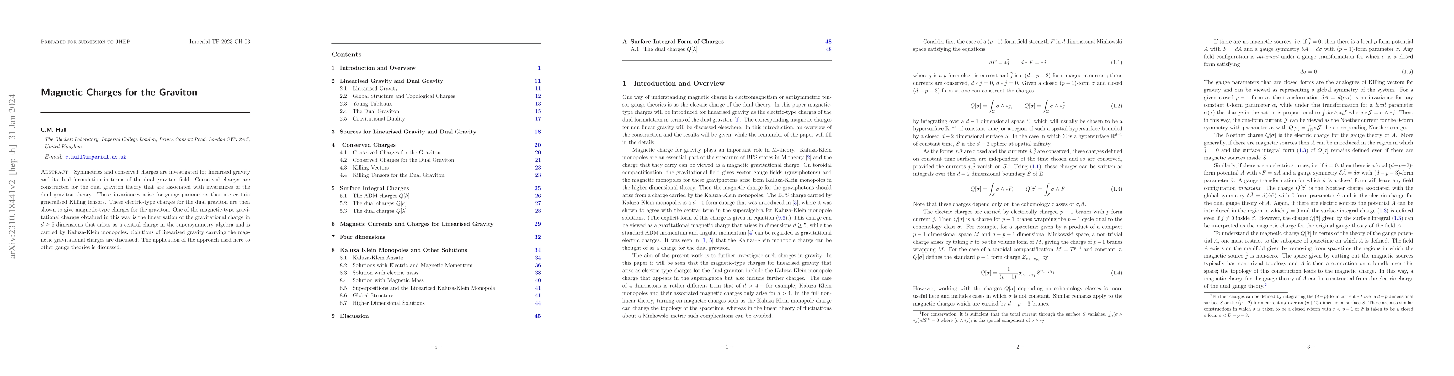 This paper investigates symmetries and conserved charges in linearised gravity and its dual formulation using dual graviton fields. It constructs magnetic-type charges for the graviton from electric-type charges of the dual graviton, revealing a connection to central charges in higher-dimensional supersymmetry algebras.