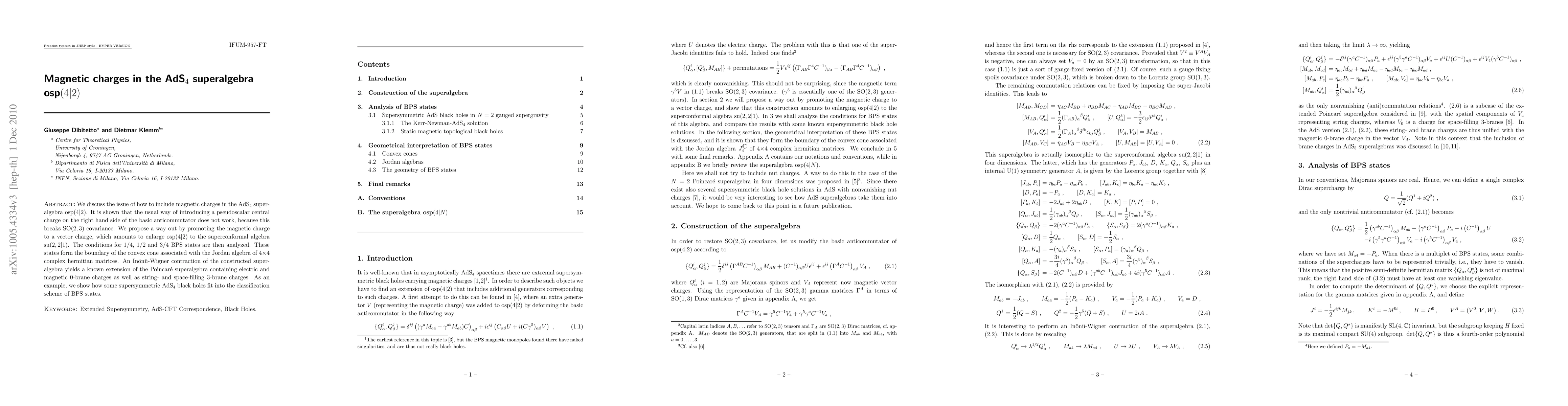 This paper explores incorporating magnetic charges into the AdS(4) superalgebra osp(4|2), finding that traditional methods break covariance, and proposes a solution by promoting magnetic charges to vector charges, expanding osp(4|2) to su(2,2|1). It also analyzes BPS states and their classification within the Jordan algebra framework.