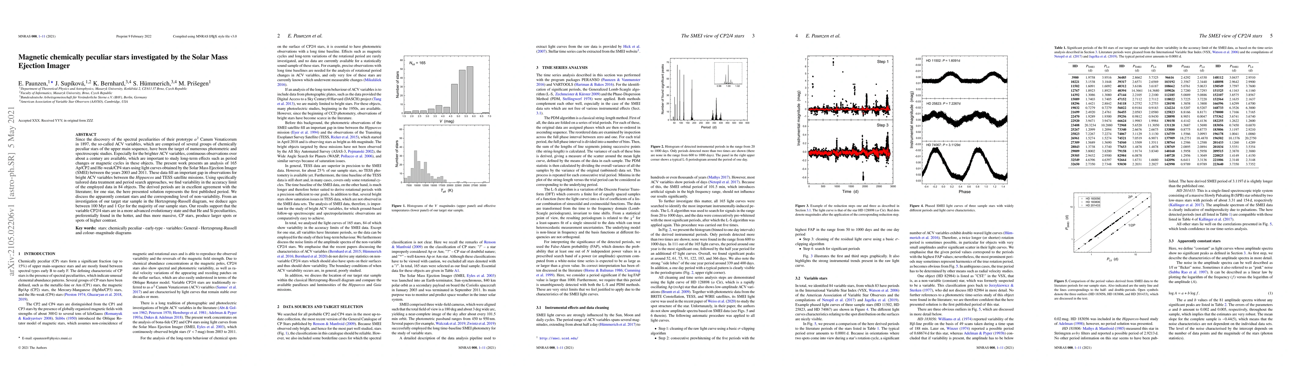 Since the discovery of the spectral peculiarities of their prototype alpha2 Canum Venaticorum in 1897, the so-called ACV variables, which are comprised of several groups of chemically peculiar stars of the upper main sequence, have been the target of numerous photometric and spectroscopic studies. Especially for the brighter ACV variables, continuous observations over about a century are available, which are important to study long-term effects such as period changes or magnetic cycles in these objects. The present work presents an analysis of 165 Ap/CP2 and He-weak/CP4 stars using light curves obtained by the Solar Mass Ejection Imager (SMEI) between the years 2003 and 2011. These data fill an important gap in observations for bright ACV variables between the Hipparcos and TESS satellite missions. Using specifically tailored data treatment and period search approaches, we find variability in the accuracy limit of the employed data in 84 objects. The derived periods are in excellent agreement with the literature; for one star, the here presented solution represents the first published period. We discuss the apparently constant stars and the corresponding level of non-variability. From an investigation of our target star sample in the Hertzsprung-Russell diagram, we deduce ages between 100 Myr and 1 Gyr for the majority of our sample stars. Our results support that the variable CP2/4 stars are in a more advanced evolutionary state and that He and Si peculiarities, preferentially found in the hotter, and thus more massive, CP stars, produce larger spots or spots of higher contrast.