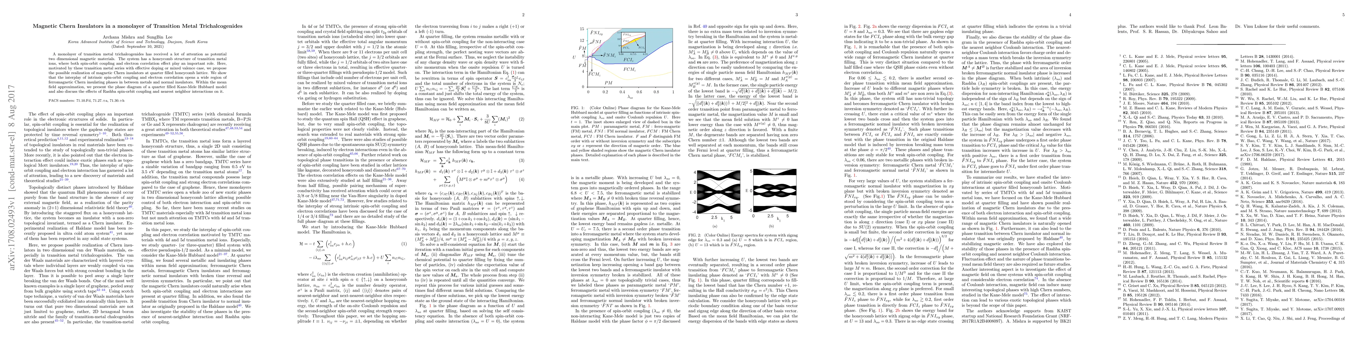 Summary: This paper investigates monolayer transition metal trichalcogenides as potential two-dimensional magnetic materials, demonstrating the possibility of realizing magnetic Chern insulators at quarter-filled honeycomb lattices. The study highlights the significant roles of spin-orbit coupling and electron correlation, presenting a phase diagram within the mean field approximation and discussing the effects of additional interactions.