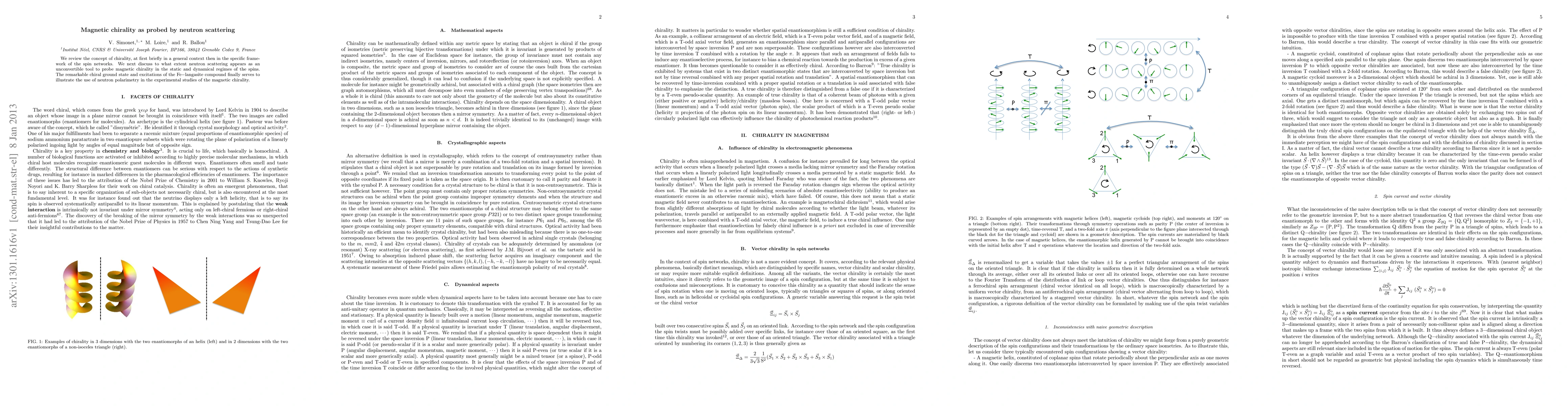 We review the concept of chirality, at first briefly in a general context then in the specific framework of the spin networks. We next discuss to what extent neutron scattering appears as an unconvertible tool to probe magnetic chirality in the static and dynamical regimes of the spins. The remarkable chiral ground state and excitations of the Fe-langasite compound finally serves to illustrate the use of neutron polarimetry in the experimental studies of the magnetic chirality.