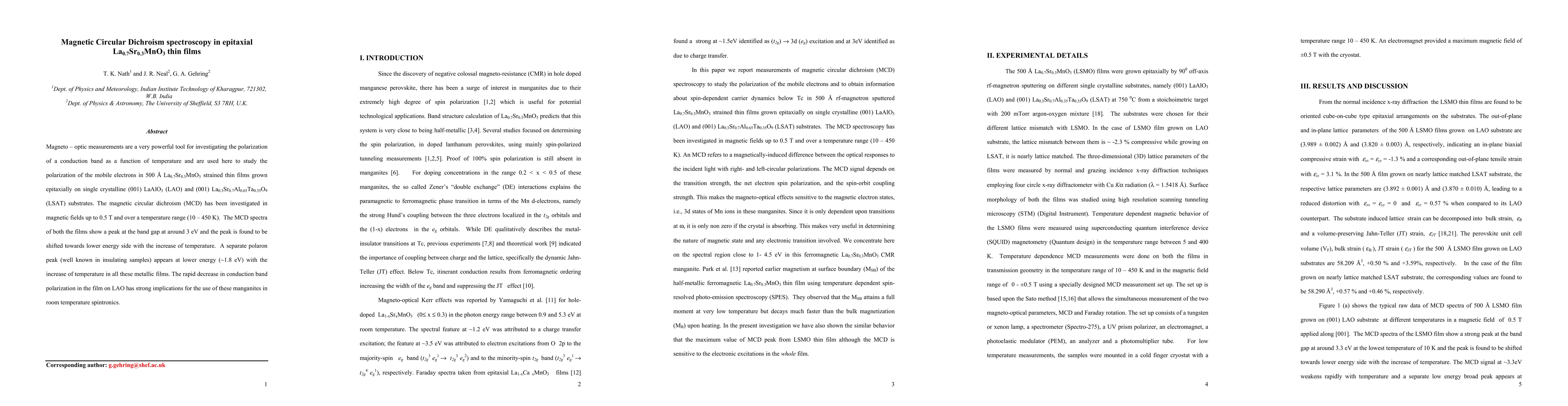Magneto optic measurements are a very powerful tool for investigating the polarization of a conduction band as a function of temperature and are used here to study the polarization of the mobile electrons in 50nm LSMO (x=0.3) strained thin films grown epitaxially on single crystalline (001) LaAlO3 (LAO) and (001) lattice matched substrate (LSAT). The magnetic circular dichroism (MCD) has been investigated in magnetic fields up to 0.5 T and over a temperature range (10 to 450 K). The MCD spectra of both the films show a peak at the band gap at around 3 eV and the peak is found to be shifted towards lower energy side with the increase of temperature. A separate polaron peak (well known in insulating samples) appears at lower energy (about 1.8 eV) with the increase of temperature in all these metallic films. The rapid decrease in conduction band polarization in the film on LAO has strong implications for the use of these manganites in room temperature spintronics.