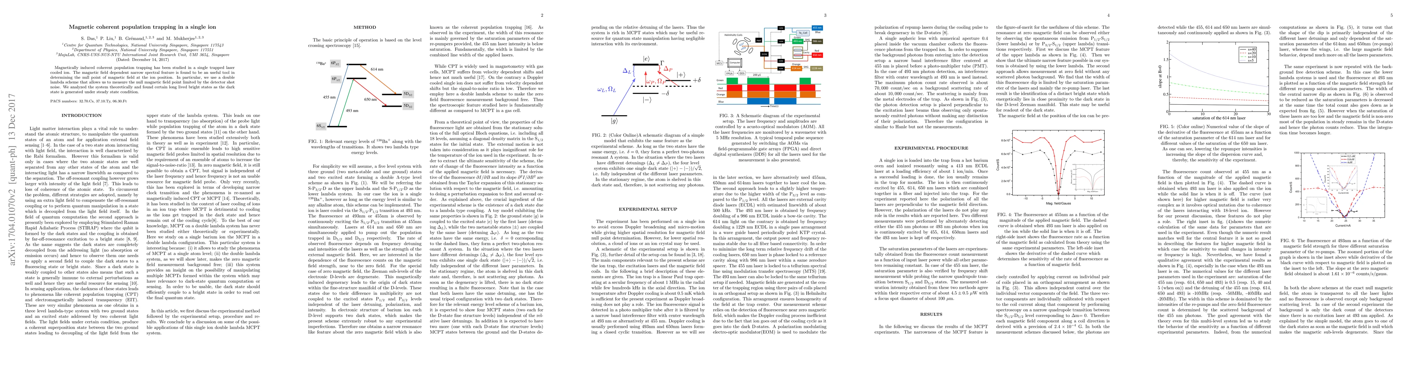 This study investigates magnetic coherent population trapping in a single trapped ion, utilizing a double lambda scheme to determine the null magnetic field point with high precision. Theoretical analysis reveals long-lived bright states generated as a dark state emerges under steady-state conditions.