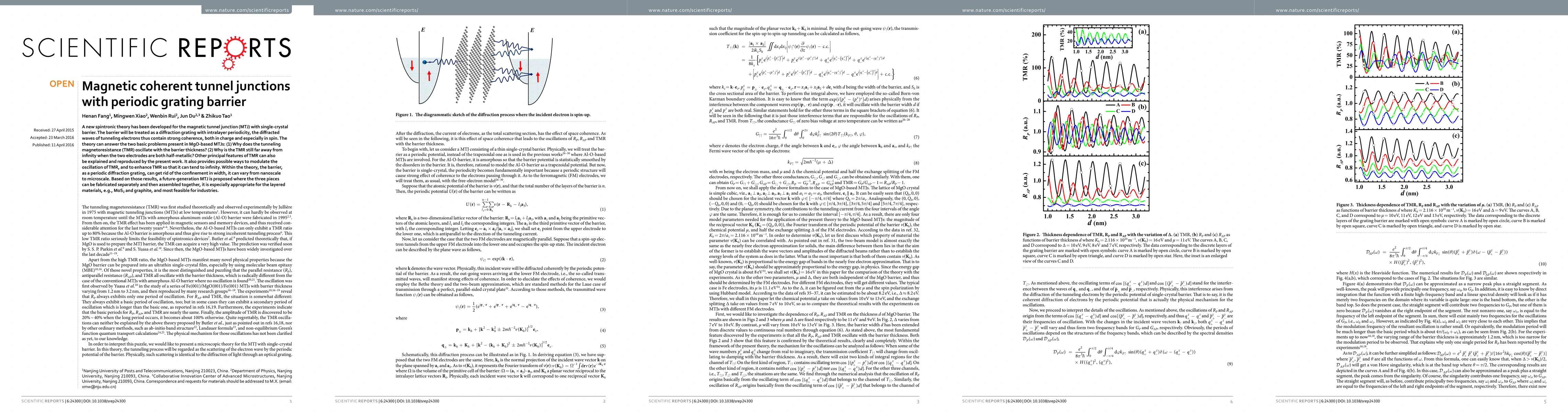 A new spintronic theory has been developed for the magnetic tunnel junction (MTJ) with single-crystal barrier. The barrier will be treated as a diffraction grating with intralayer periodicity, the diffracted waves of tunneling electrons thus contain strong coherence, both in charge and especially in spin. The theory can answer the two basic problems present in MgO-based MTJs: (1) Why does the tunneling magnetoresistance (TMR) oscillate with the barrier thickness? (2) Why is the TMR still far away from infinity when the two electrodes are both half-metallic? Other principal features of TMR can also be explained and reproduced by the present work. It also provides possible ways to modulate the oscillation of TMR, and to enhance TMR so that it can tend to infinity. Within the theory, the barrier, as a periodic diffraction grating, can get rid of the confinement in width, it can vary from nanoscale to microscale. Based on those results, a future-generation MTJ is proposed where the three pieces can be fabricated separately and then assembled together, it is especially appropriate for the layered materials, e.g., MoS2 and graphite, and most feasible for industries.