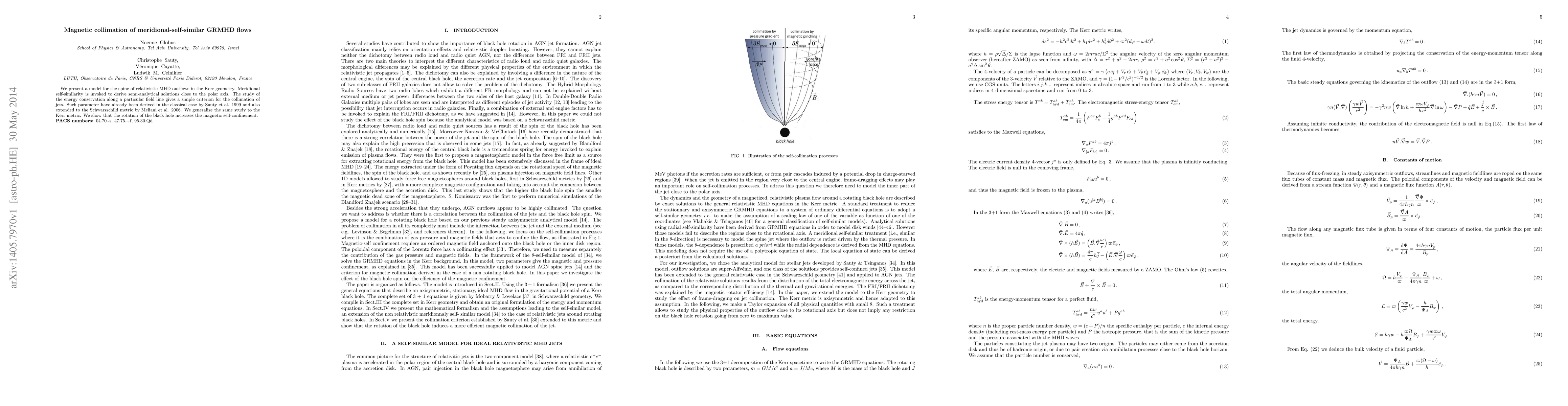 We present a model for the spine of relativistic MHD outflows in the Kerr geometry. Meridional self-similarity is invoked to derive semi-analytical solutions close to the polar axis. The study of the energy conservation along a particular field line gives a simple criterion for the collimation of jets. Such parameter have already been derived in the classical case by Sauty et al. 1999 and also extended to the Schwarzschild metric by Meliani et al. 2006. We generalize the same study to the Kerr metric. We show that the rotation of the black hole increases the magnetic self-confinement.