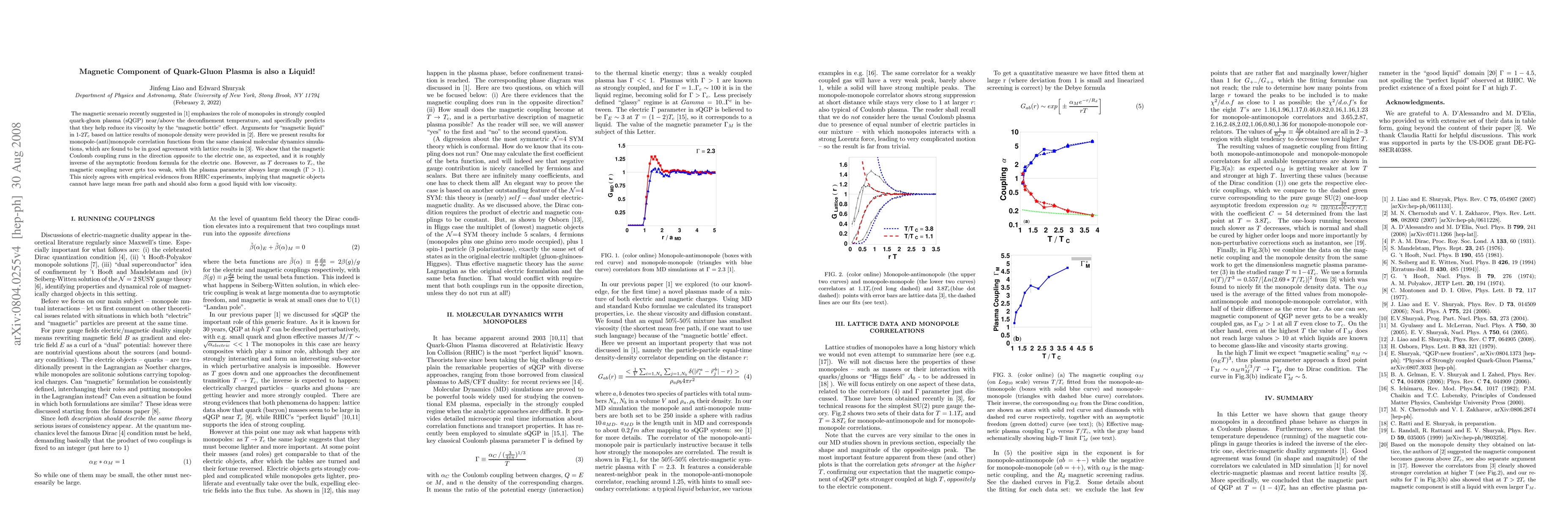 The so called magnetic scenario recently suggested in \cite{Liao_ES_mono} emphasizes the role of monopoles in strongly coupled quark-gluon plasma (sQGP) near/above the deconfinement temperature, and specifically predicts that they help reduce its viscosity by the so called "magnetic bottle" effect. Arguments for "magnetic liquid" in 1-2$T_c$ based on lattice measurement of monopole density were provided in \cite{Chernodub}. Here we present results for monopole-(anti)monopole correlation functions from the same classical molecular dynamics simulations, which are found to be in very good agreement with recent lattice results \cite{D'Alessandro:2007su}. We show that the magnetic Coulomb coupling does run in the direction $opposite$ to the electric one, as expected, and it is roughly inverse of the asymptotic freedom formula for the electric one. However, as $T$ decreases to $T_c$, the magnetic coupling never gets weak, with the plasma parameter always large enough ($\Gamma>1$). This nicely agrees with empirical evidences from RHIC experiments, implying that magnetic objects cannot have large mean free path and should also form a good liquid with low viscosity.