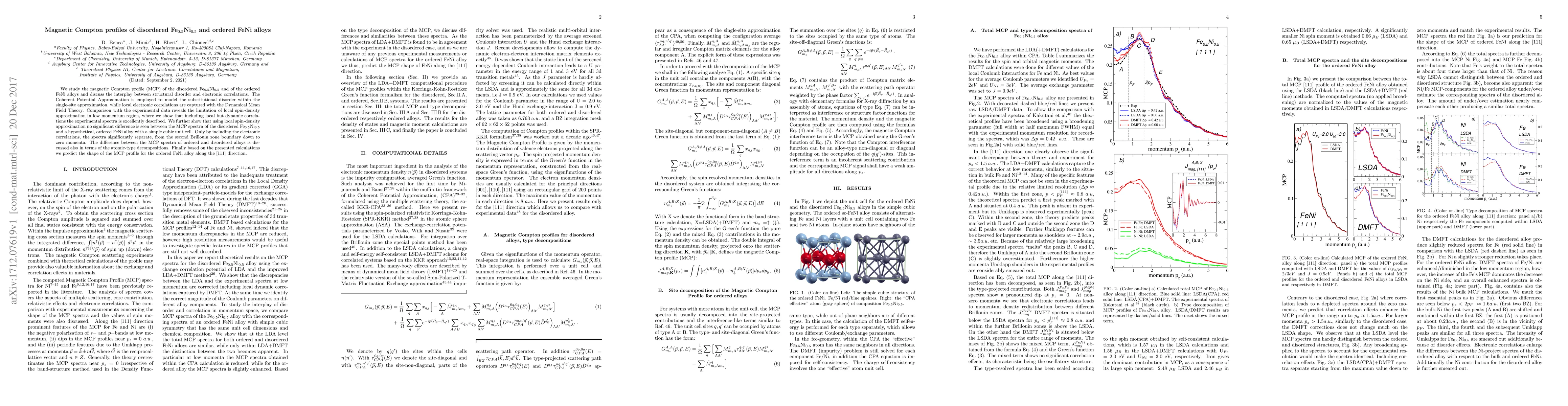 We study the magnetic Compton profile (MCP) of the disordered Fe$_{0.5}$Ni$_{0.5}$ and of the ordered FeNi alloys and discuss the interplay between structural disorder and electronic correlations. The Coherent Potential Approximation is employed to model the substitutional disorder within the single-site approximation, while local electronic correlations are captured with the Dynamical Mean Field Theory. Comparison with the experimental data reveals the limitation of local spin-density approximation in low momentum region, where we show that including local but dynamic correlations the experimental spectra is excellently described. We further show that using local spin-density approximation no significant difference is seen between the MCP spectra of the disordered Fe$_{0.5}$Ni$_{0.5}$ and a hypothetical, ordered FeNi alloy with a simple cubic unit cell. Only by including the electronic correlations, the spectra significantly separate, from the second Brillouin zone boundary down to zero momenta. The difference between the MCP spectra of ordered and disordered alloys is discussed also in terms of the atomic-type decompositions. Finally based on the presented calculations we predict the shape of the MCP profile for the ordered FeNi alloy along the [111] direction.