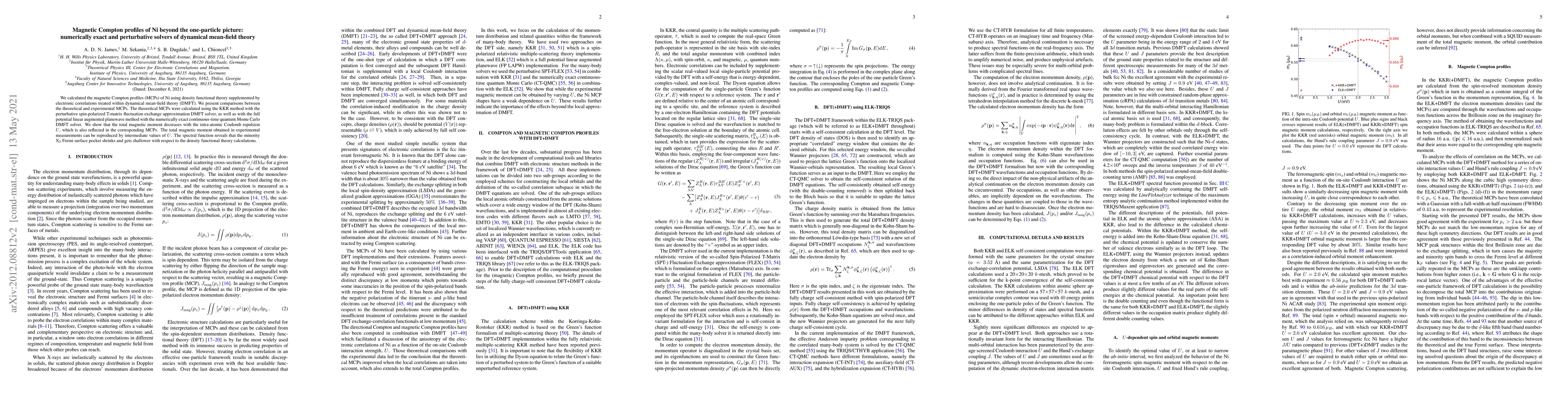 We calculated the magnetic Compton profiles (MCPs) of Ni using density functional theory supplemented by electronic correlations treated within dynamical mean-field theory (DMFT). We present comparisons between the theoretical and experimental MCPs. The theoretical MCPs were calculated using the KKR method with the perturbative spin-polarized T-matrix fluctuation exchange approximation DMFT solver, as well as with the full potential linear augmented planewave method with the numerically exact continuous-time quantum Monte Carlo DMFT solver. We show that the total magnetic moment decreases with the intra-atomic Coulomb repulsion $U$, which is also reflected in the corresponding MCPs. The total magnetic moment obtained in experimental measurements can be reproduced by intermediate values of $U$. The spectral function reveals that the minority X$_2$ Fermi surface pocket shrinks and gets shallower with respect to the density functional theory calculations.