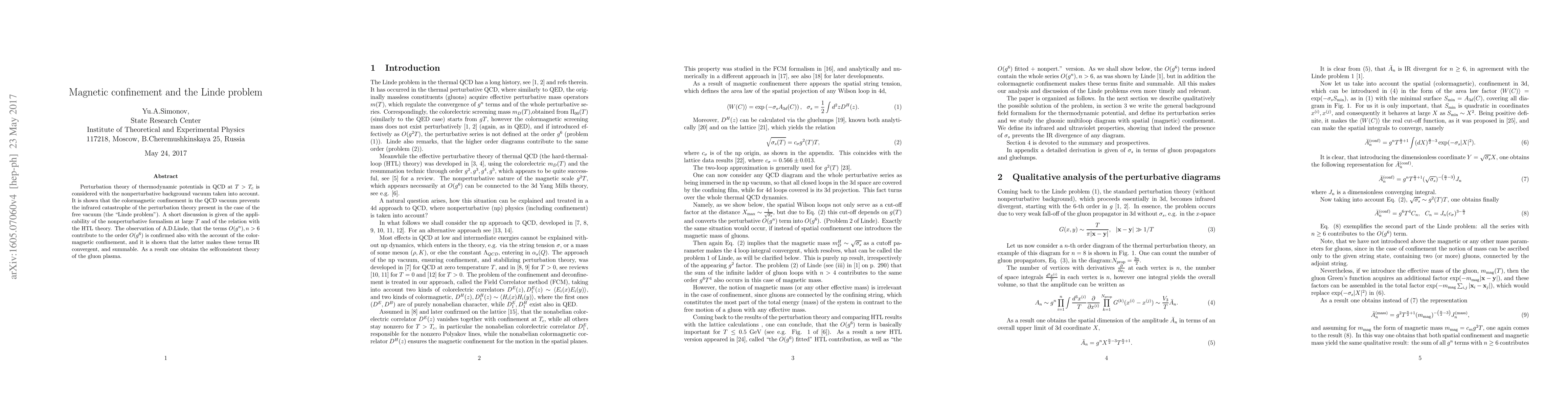This paper explores the perturbation theory of thermodynamic potentials in QCD at temperatures above the critical temperature, emphasizing the role of magnetic confinement in the QCD vacuum. It demonstrates that magnetic confinement resolves the "Linde problem" by preventing the infrared catastrophe seen in free vacuum scenarios, leading to a self-consistent theory of the gluon plasma.