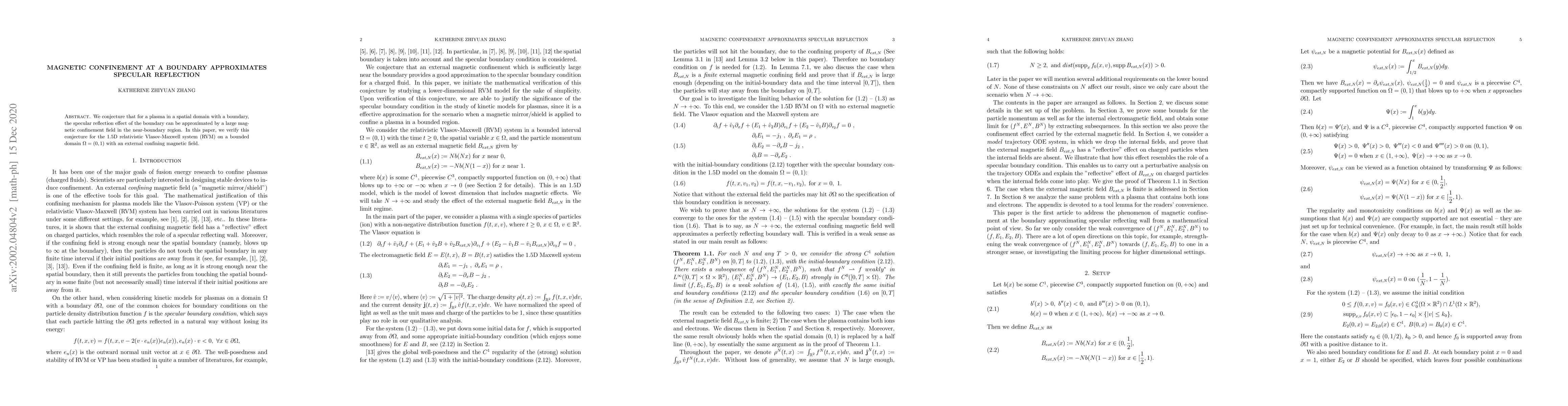 The paper presents rigorous mathematical proofs and lemmas to establish the approximation of specular reflection by strong magnetic confinement in the context of the 1.5D RVM system.