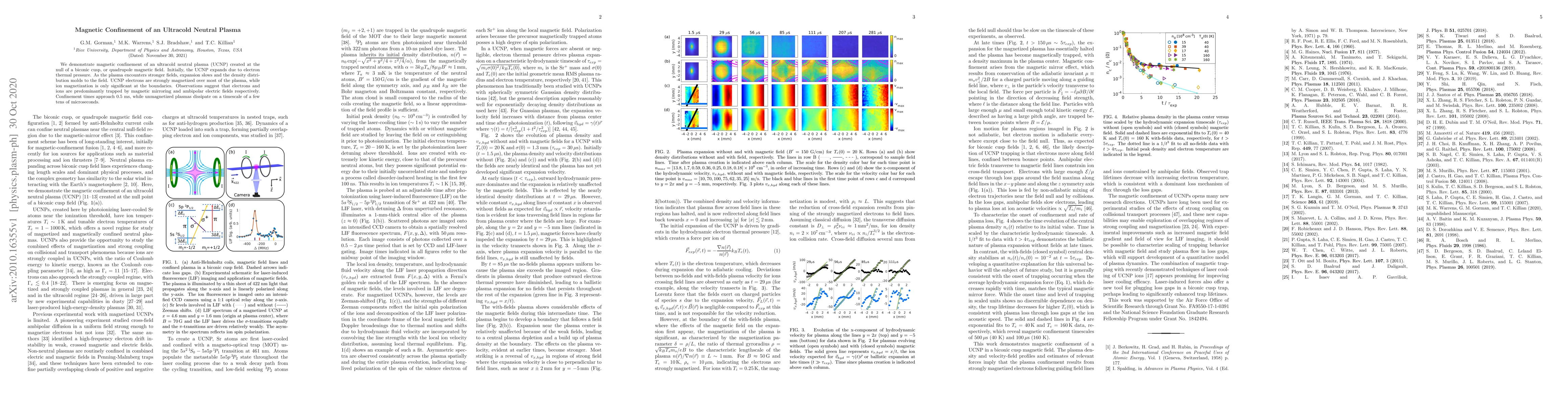 This study demonstrates magnetic confinement of an ultracold neutral plasma (UCNP) at a magnetic field null, showing that electrons are predominantly trapped by magnetic mirroring while ions are trapped by ambipolar electric fields, achieving confinement times of up to 0.5 ms compared to microsecond dissipation in unmagnetized plasmas.