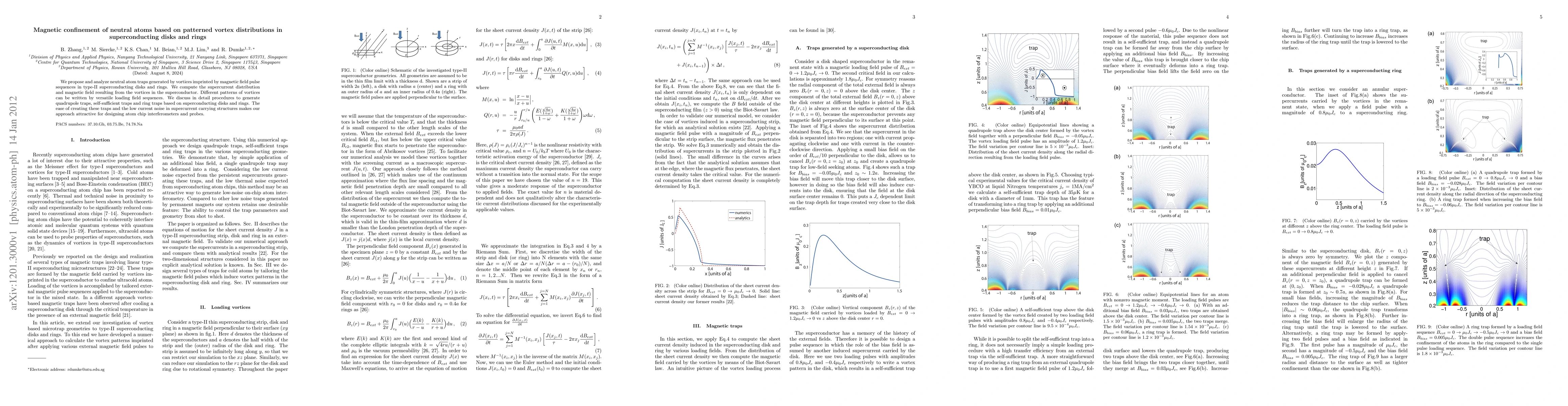 This paper proposes a method for magnetic confinement of neutral atoms using patterned vortex distributions in superconducting disks and rings created by magnetic field pulse sequences. The study computes the supercurrent distribution and magnetic field from these vortices, and details procedures for creating quadrupole, self-sufficient, and ring traps, highlighting their potential for atom chip interferometers and probes due to their simplicity and low current noise.