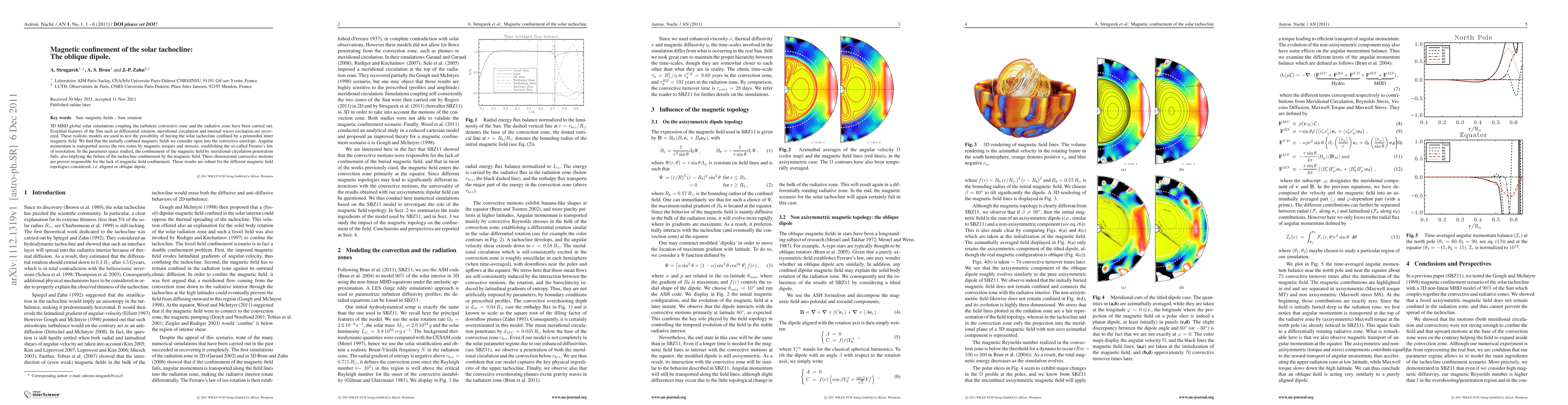 3D MHD global solar simulations coupling the turbulent convective zone and the radiative zone have been carried out. Essential features of the Sun such as differential rotation, meridional circulation and internal waves excitation are recovered. These realistic models are used to test the possibility of having the solar tachocline confined by a primordial inner magnetic field. We find that the initially confined magnetic fields we consider open into the convective envelope. Angular momentum is transported across the two zones by magnetic torques and stresses, establishing the so-called Ferarro's law of isorotation. In the parameter space studied, the confinement of the magnetic field by meridional circulation penetration fails, also implying the failure of the tachocline confinement by the magnetic field. Three-dimensional convective motions are proven responsible for the lack of magnetic field confinement. Those results are robust for the different magnetic field topologies considered, i.e. aligned or oblique dipole.