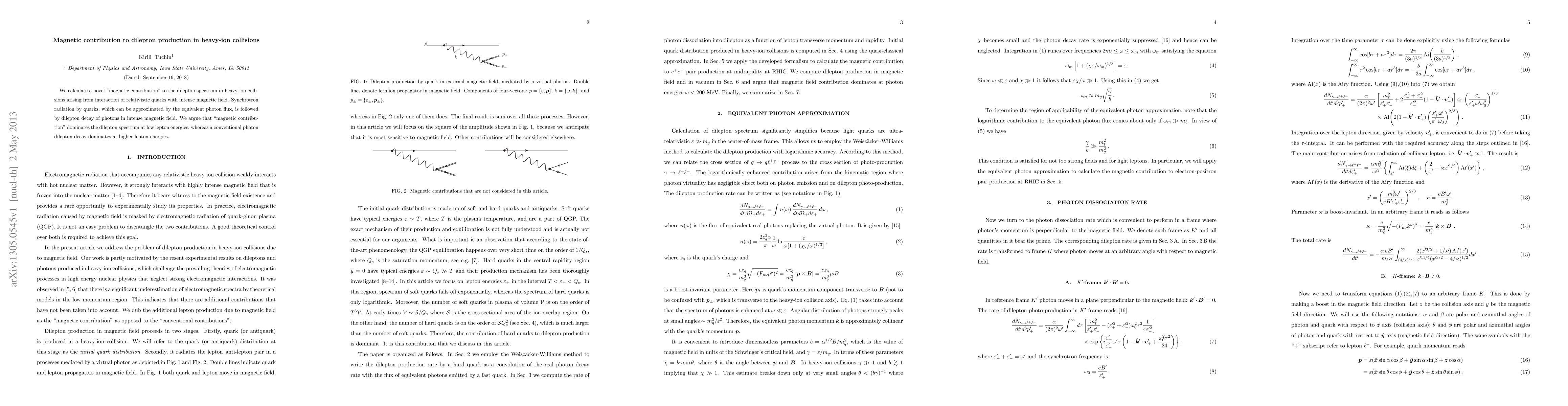 This paper investigates a novel "magnetic contribution" to dilepton production in heavy-ion collisions, attributing it to relativistic quarks interacting with intense magnetic fields. It concludes that this magnetic effect dominates at low lepton energies, while conventional photon decay dominates at higher energies.