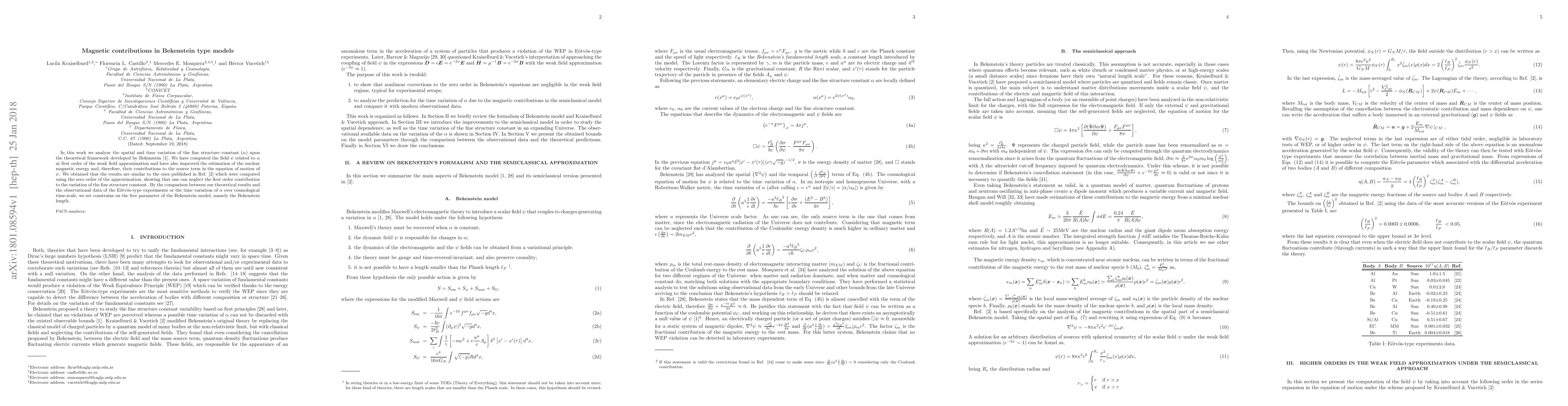 In this work we analyze the spatial and time variation of the fine structure constant (\alpha) upon the theoretical framework developed by Bekenstein [1]. We have computed the field \psi related to \alpha at first order of the weak field approximation and have also improved the estimation of the nuclear magnetic energy and, therefore, their contributions to the source term in the equation of motion of \psi. We obtained that the results are similar to the ones published in Ref. [2] which were computed using the zero order of the approximation, showing that one can neglect the first order contribution to the variation of the fine structure constant. By the comparison between our theoretical results and the observational data of the E\"otv\"os-type experiments or the time variation of \alpha over cosmological time-scale, we set constrains on the free parameter of the Bekenstein model, namely the Bekenstein length.