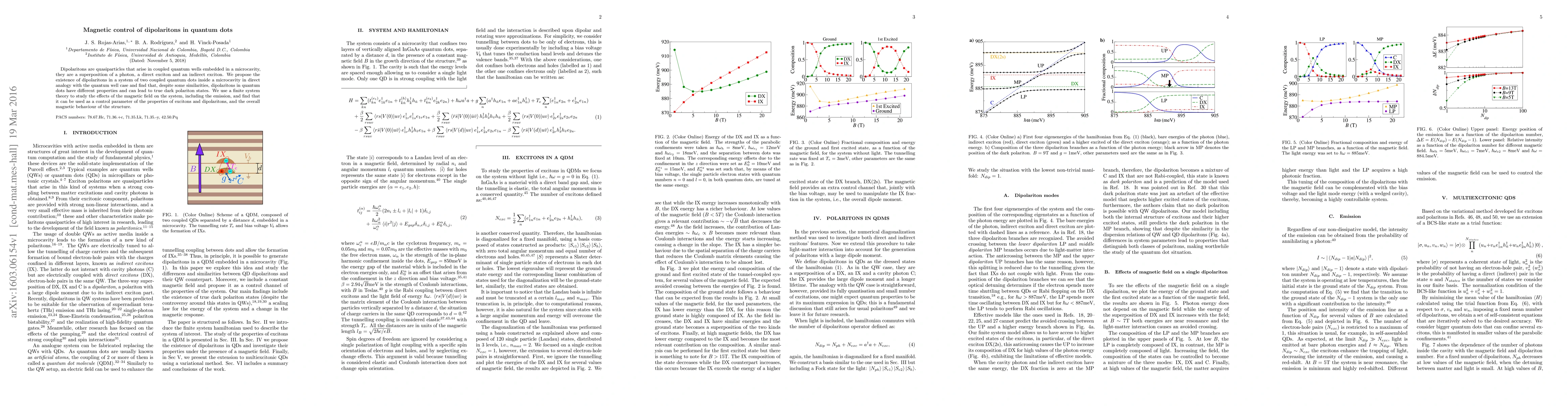 This paper investigates dipolaritons in coupled quantum dots within a microcavity, revealing unique properties compared to quantum wells, including the potential for dark polariton states. The study demonstrates that magnetic fields can control the emission and properties of these quasiparticles, influencing the overall magnetic behavior of the system.