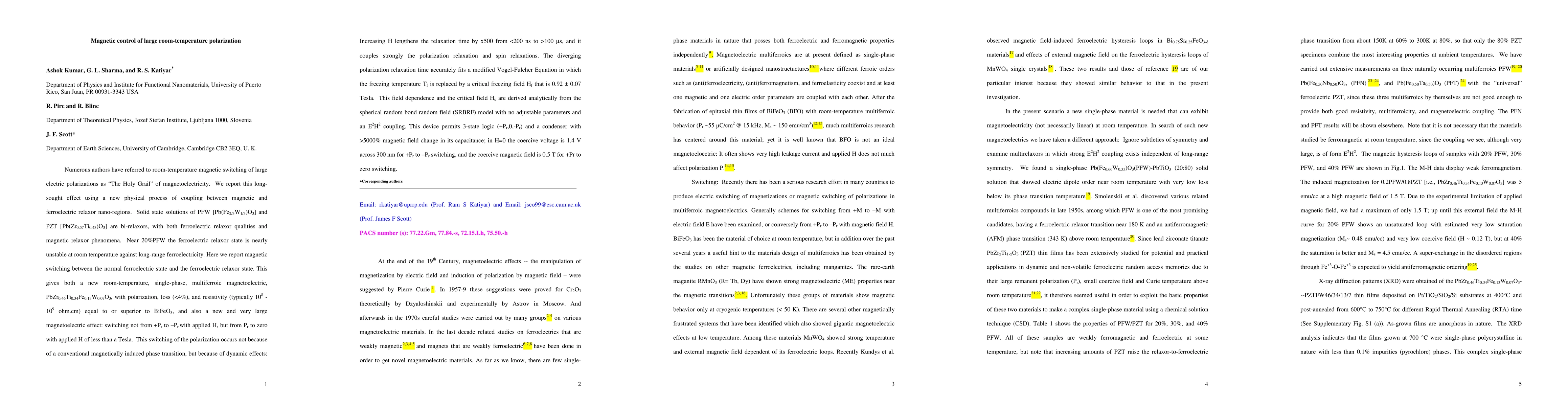 Numerous authors have referred to room-temperature magnetic switching of large electric polarizations as The Holy Grail of magnetoelectricity.We report this long-sought effect using a new physical process of coupling between magnetic and ferroelectric relaxor nano-regions. Here we report magnetic switching between the normal ferroelectric state and the ferroelectric relaxor state. This gives both a new room-temperature, single-phase, multiferroic magnetoelectric, PbZr0.46Ti0.34Fe0.13W0.07O3, with polarization, loss (<4%), and resistivity (typically 108 -109 ohm.cm) equal to or superior to BiFeO3, and also a new and very large magnetoelectric effect: switching not from +Pr to negative Pr with applied H, but from Pr to zero with applied H of less than a Tesla. This switching of the polarization occurs not because of a conventional magnetically induced phase transition, but because of dynamic effects: Increasing H lengthens the relaxation time by x500 from <200 ns to >100 ?s, and it couples strongly the polarization relaxation and spin relaxations. The diverging polarization relaxation time accurately fits a modified Vogel-Fulcher Equation in which the freezing temperature Tf is replaced by a critical freezing field Hf that is 0.92 positive/negative 0.07 Tesla. This field dependence and the critical field Hc are derived analytically from the spherical random bond random field (SRBRF) model with no adjustable parameters and an E2H2 coupling. This device permits 3-state logic (+Pr,0,negative Pr) and a condenser with >5000% magnetic field change in its capacitance.
