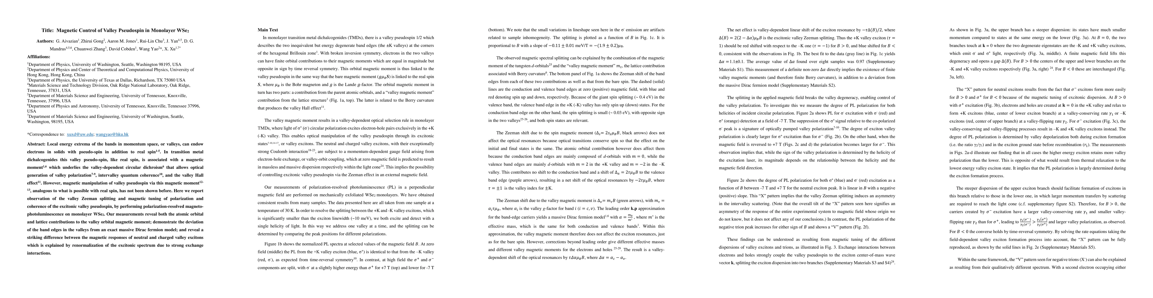 This paper demonstrates magnetic manipulation of valley pseudospin in monolayer WSe2 through valley Zeeman splitting, revealing contributions from atomic orbitals and lattice effects. The study also highlights differences in magnetic responses between neutral and charged excitons due to strong exchange interactions.