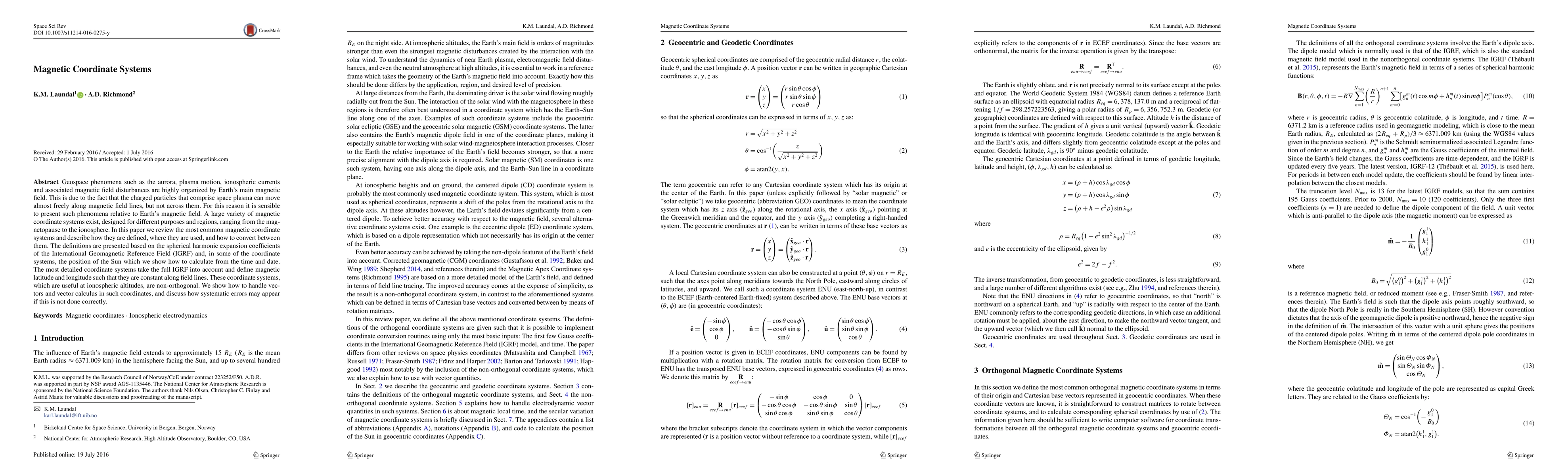 Geospace phenomena such as the aurora, plasma motion, ionospheric currents and associated magnetic field disturbances are highly organized by Earth's main magnetic field. This is due to the fact that the charged particles that comprise space plasma can move almost freely along magnetic field lines, but not across them. For this reason it is sensible to present such phenomena relative to Earth's magnetic field. A large variety of magnetic coordinate systems exist, designed for different purposes and regions, ranging from the magnetopause to the ionosphere. In this paper we review the most common magnetic coordinate systems and describe how they are defined, where they are used, and how to convert between them. The definitions are presented based on the spherical harmonic expansion coefficients of the International Geomagnetic Reference Field (IGRF) and, in some of the coordinate systems, the position of the Sun which we show how to calculate from the time and date. The most detailed coordinate systems take the full IGRF into account and define magnetic latitude and longitude such that they are constant along field lines. These coordinate systems, which are useful at ionospheric altitudes, are non-orthogonal. We show how to handle vectors and vector calculus in such coordinates, and discuss how systematic errors may appear if this is not done correctly.