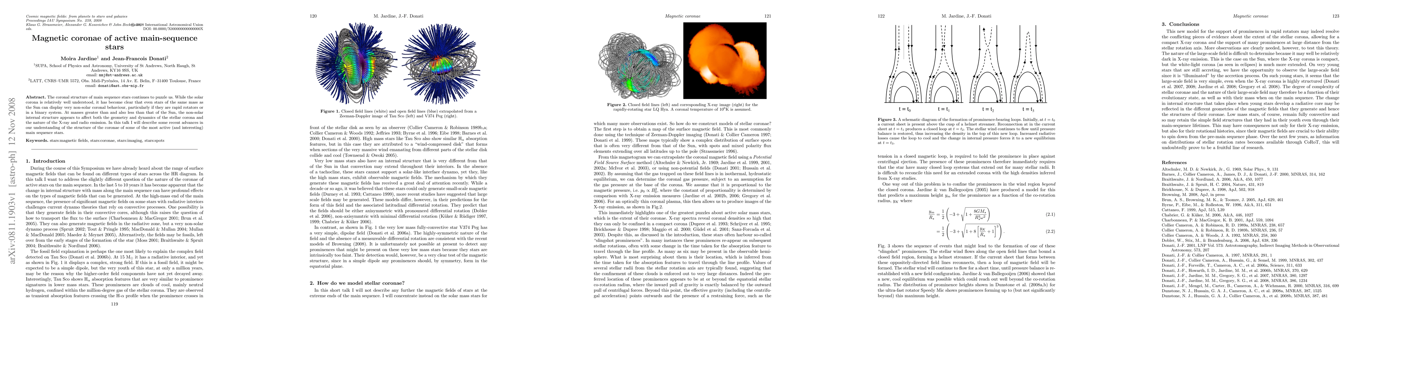 This paper discusses recent advances in understanding the coronal structure of active main-sequence stars, highlighting how non-solar internal structures influence the geometry and dynamics of stellar coronae, and the resulting X-ray and radio emissions, particularly in rapid rotators and binary systems.
