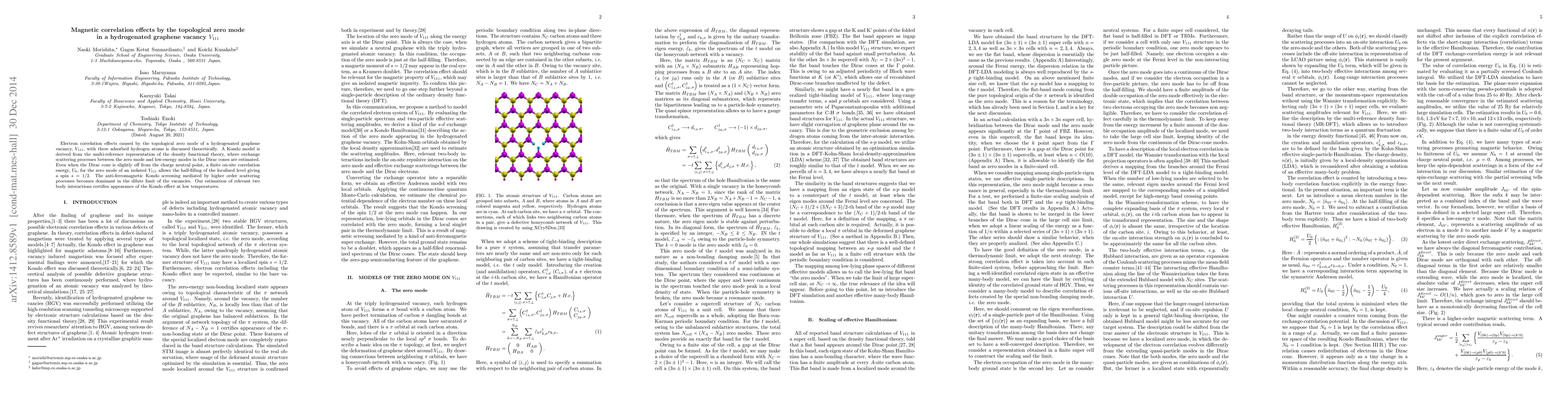 Electron correlation effects caused by the topological zero mode of a hydrogenated graphene vacancy, $V_{111}$, with three adsorbed hydrogen atoms is discussed theoretically. A Kondo model is derived from the multi-reference representation of the density functional theory, where exchange scattering processes between the zero mode and low-energy modes in the Dirac cones are estimated. Even when the Dirac cone is slightly off from the charge neutral point, a finite on-site correlation energy, $U_0$, for the zero mode of an isolated $V_{111}$ allows the half-filling of the localized level giving a spin $s=1/2$. The anti-ferromagnetic Kondo screening mediated by higher order scattering processes becomes dominant in the dilute limit of the vacancies. Our estimation of relevant two body interactions certifies appearance of the Kondo effect at low temperatures.