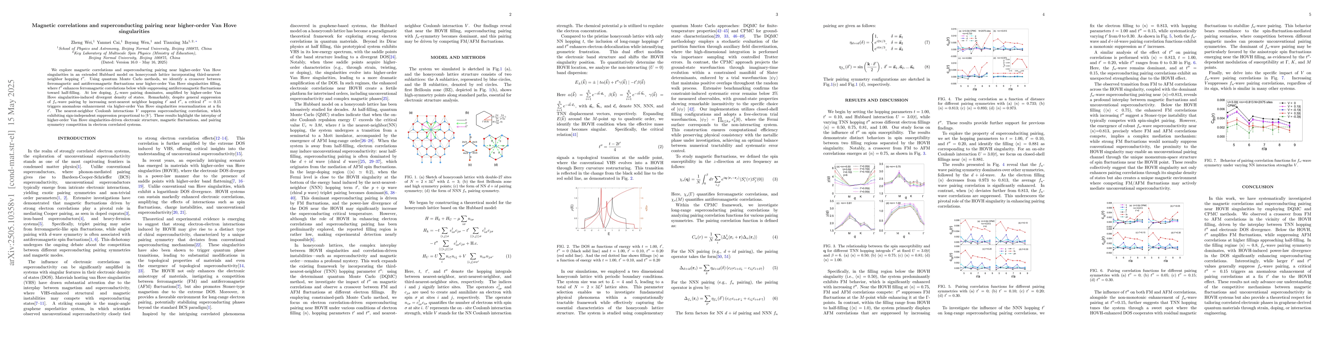 The paper presents a detailed analysis of magnetic correlations and superconducting pairing near higher-order Van Hove singularities using quantum Monte Carlo methods, revealing unique interplay between electronic structure, magnetic fluctuations, and pairing symmetry.