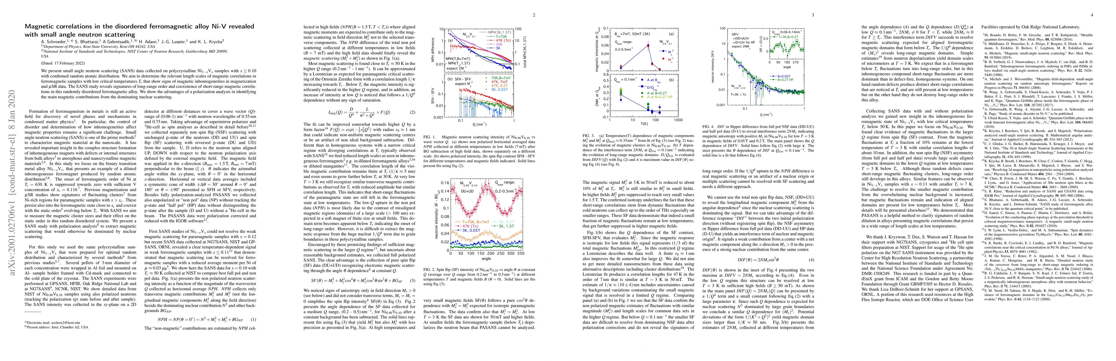 Small angle neutron scattering (SANS) reveals long-range magnetic order and short-range magnetic correlations in disordered ferromagnetic Ni-V alloys. Polarization analysis aids in distinguishing magnetic contributions amidst dominant nuclear scattering.