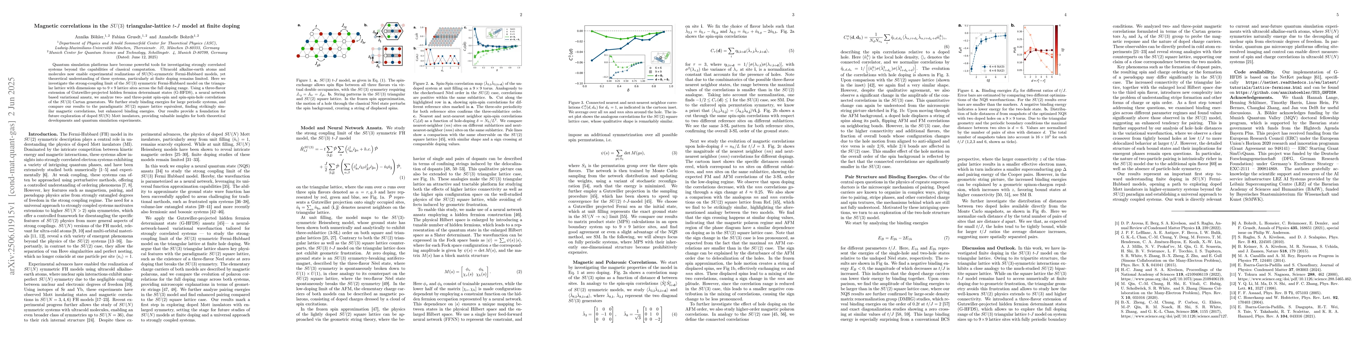 The development and application of a three-flavor G-HFDS variational ansatz combined with a neural network approach for analyzing magnetic correlations and binding energies in the SU(3) symmetric Fermi-Hubbard model.
